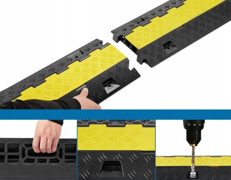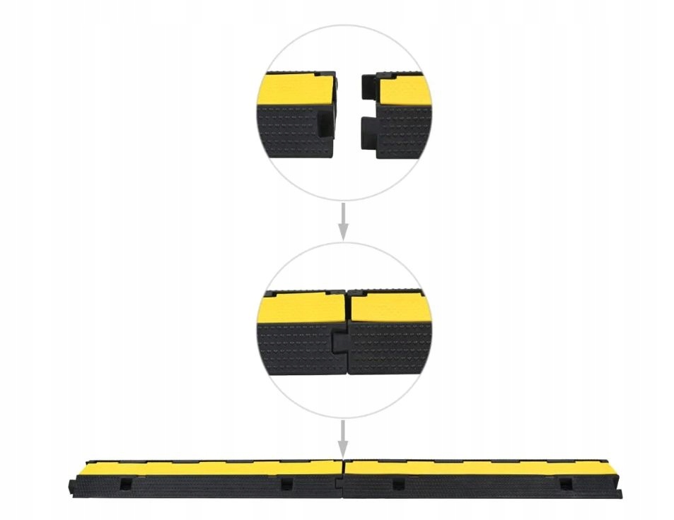 Соединяемая конструкция длиной 100 см позволяет безопасно проводить кабели по путям связи, дорогам, тротуарам или складам, предотвращая повреждение кабелей и исключая риск спотыкания.