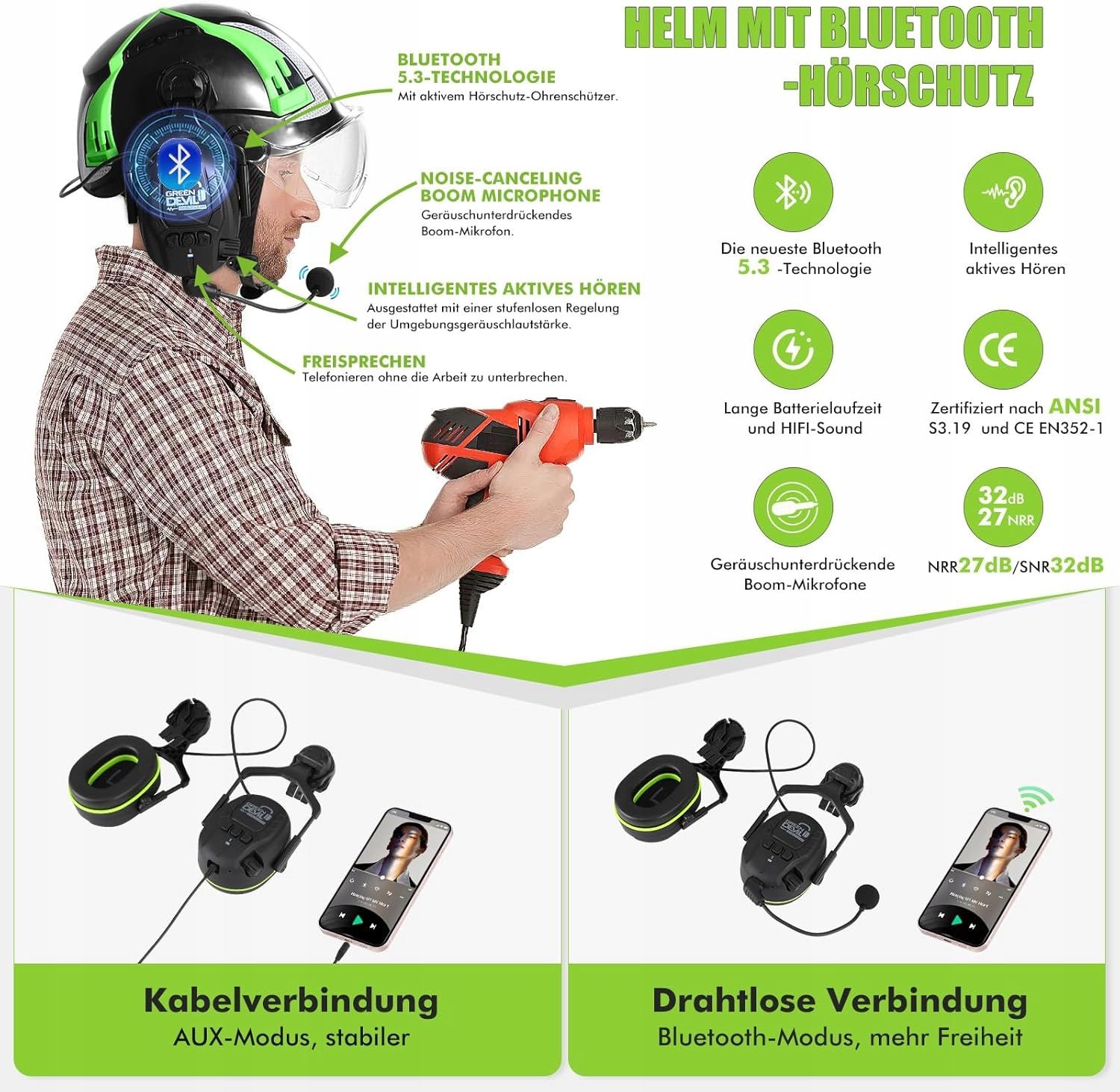 зеленый дьявол x -caror - защитный шлем из Bluetooth, En397, SNR 32db h1>