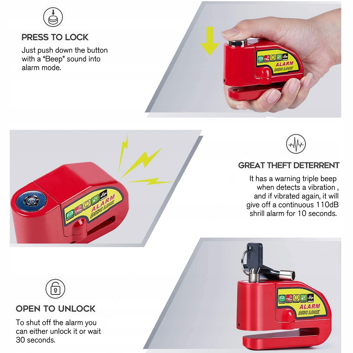 ✅ Этот блокировка дискового тормоза была создана для защиты мотоциклов или велосипедов от потенциальной кражи. Замок оснащен звуковой сигнализацией 110 дБ, который обнаружит удары и отпугнут воров. Вы можете блокировать мотоциклы или велосипеды при парковке дома или снаружи