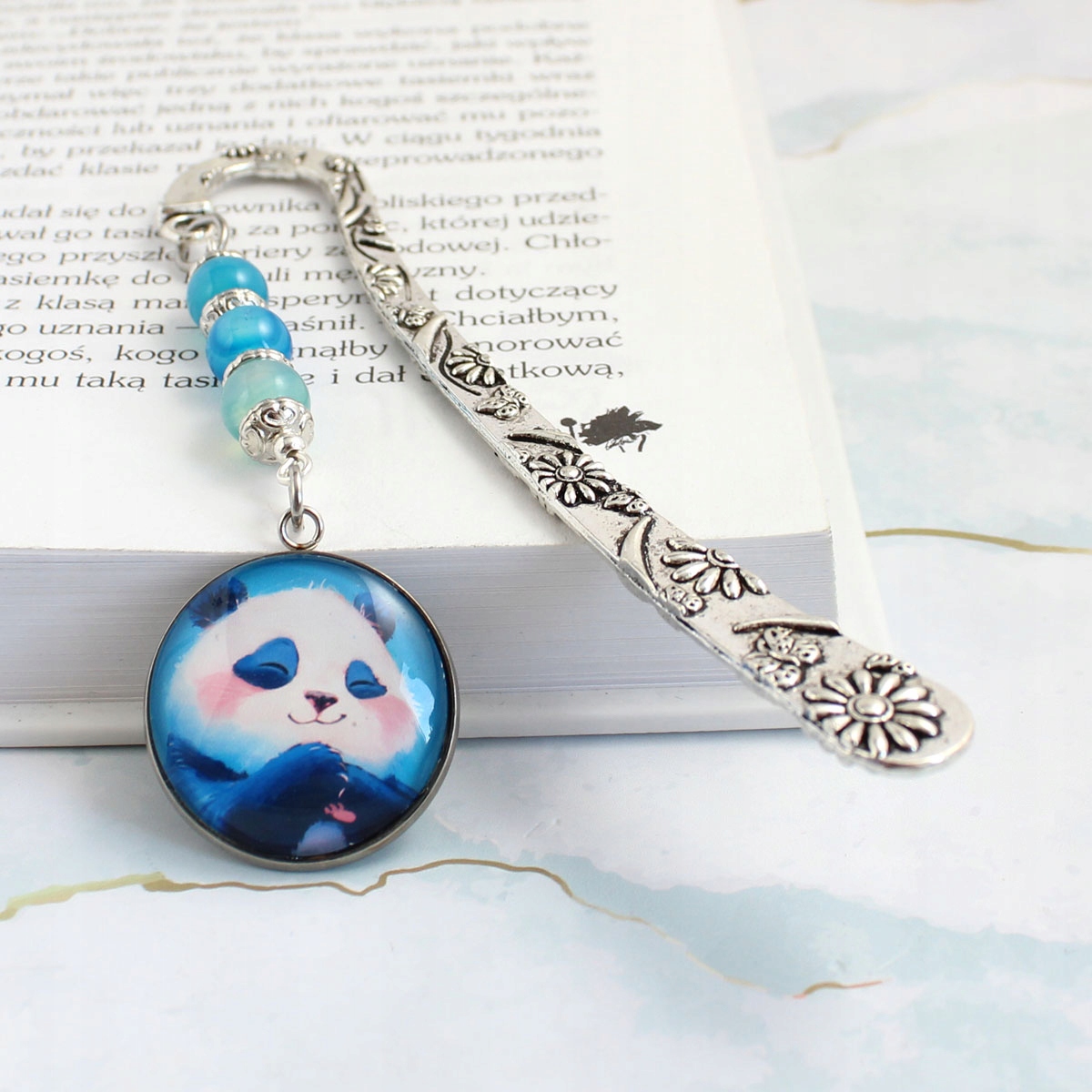 Закладка выполнена из элементов старинного серебристого цвета, украшена милым оригинальным рисунком панды, заключенным под выпуклое стекло. Стиль иллюстрации отсылает к сказочной эстетике - полной мягкости и нежности.