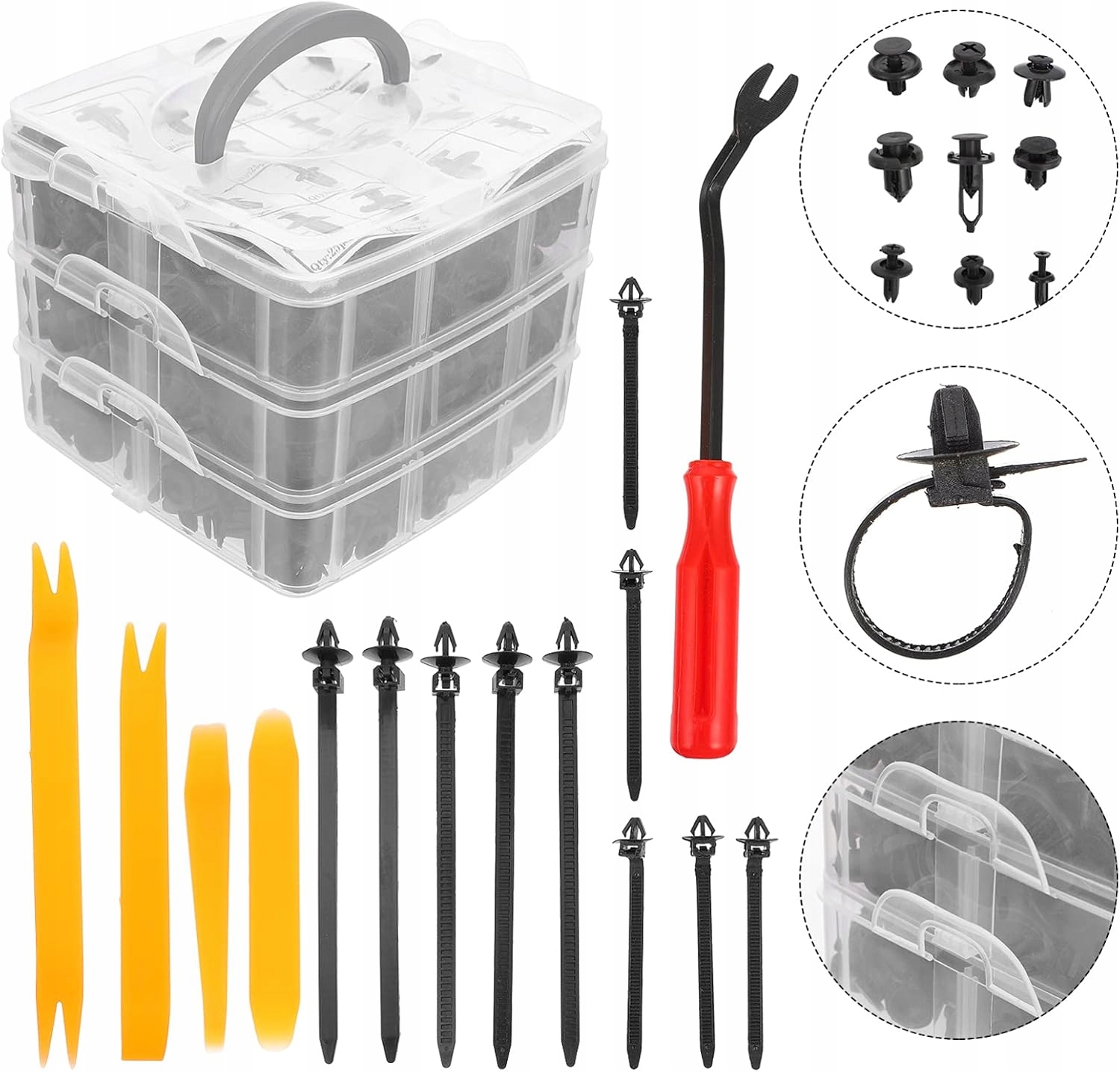 Набор включает в себя практическое отвод, который облегчает разборку обивки без риска повреждения. Все упаковано в удобную коробку с отсеками, что обеспечивает удобство хранения и быстрый доступ к необходимым элементам.