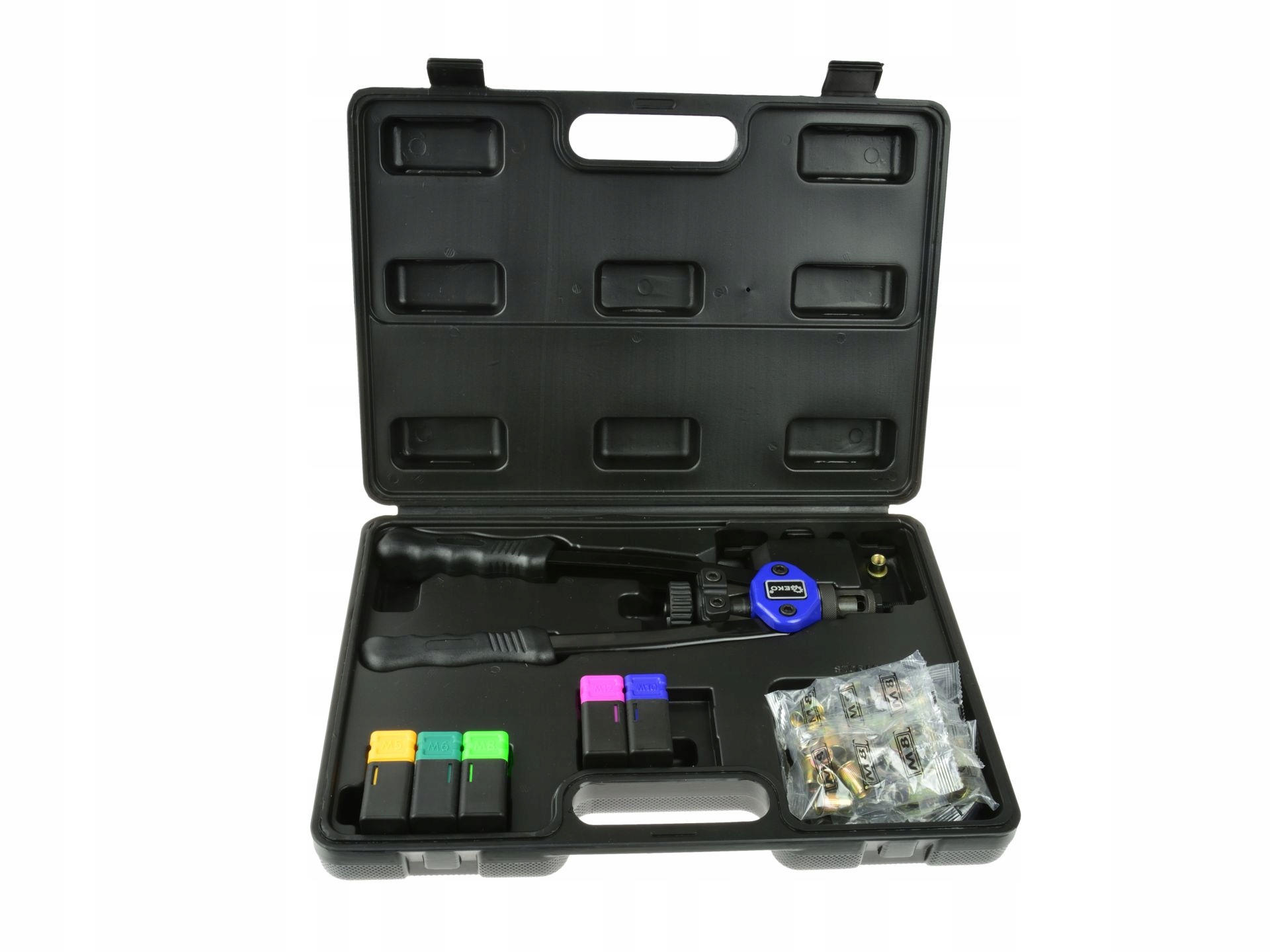 Профессиональный заклепочник предназначен для соединения различных типов материалов с помощью гаек-заклепок. Заклепочник изготовлен из материалов высочайшего качества. Комплектуется набором из пяти головок типоразмеров: М5, М6, М8, М10, М12. Использование заклепок-гаек позволяет прикручивать дополнительные элементы с помощью винта по размеру заклепки-гайки.