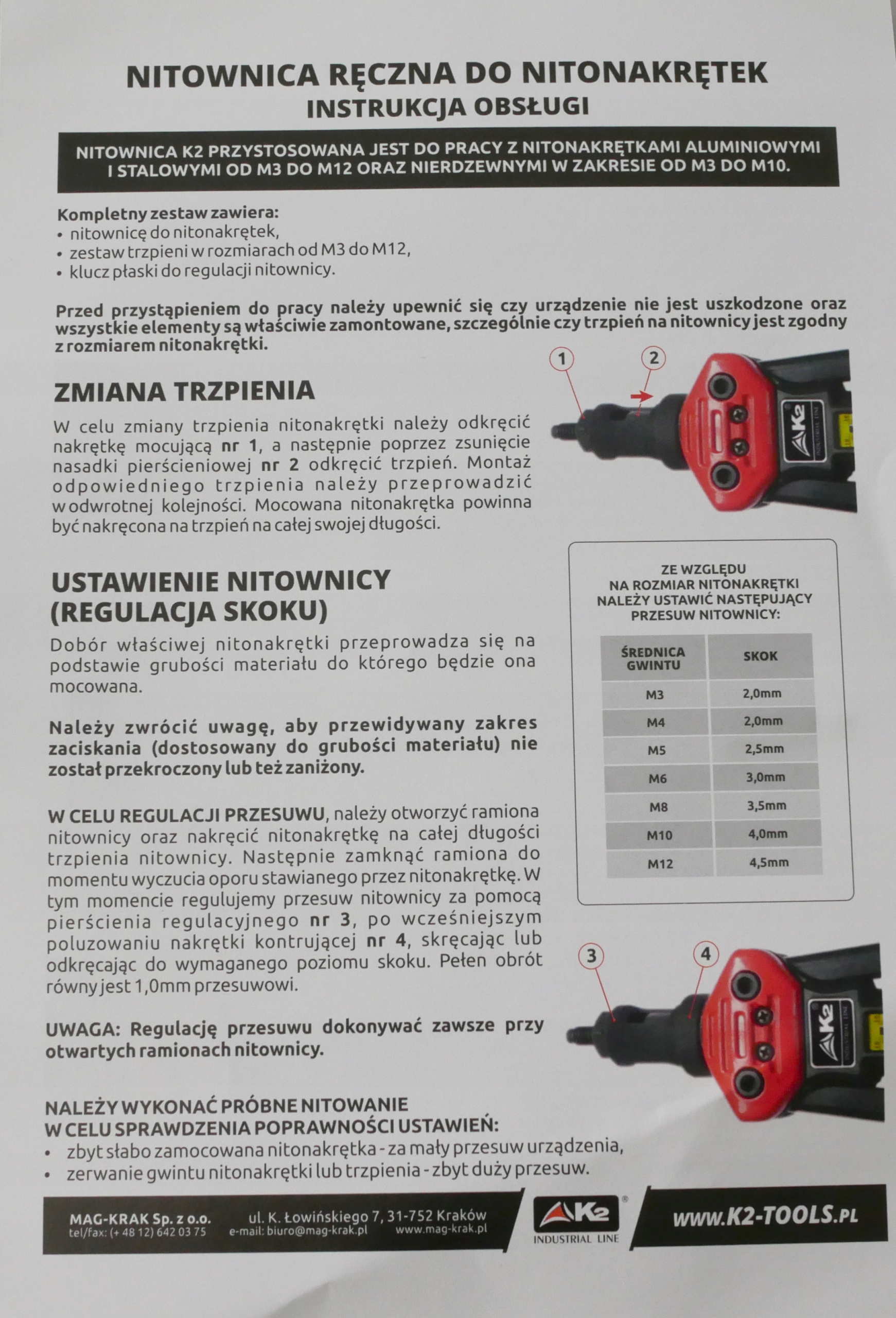 В стоимость входит комплект: заклепка-гайка-заклепочник, набор оправок типоразмерами от М3 до М12, рожковый ключ для регулировки заклепочника.