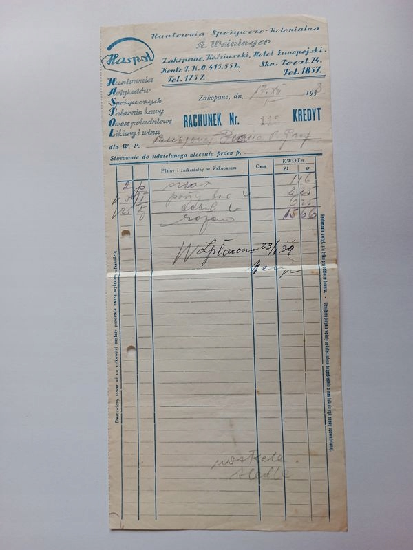 ЗАКОПАНЕ WEININGER HOTEL РАХУНОК 1938 R 0197 D1