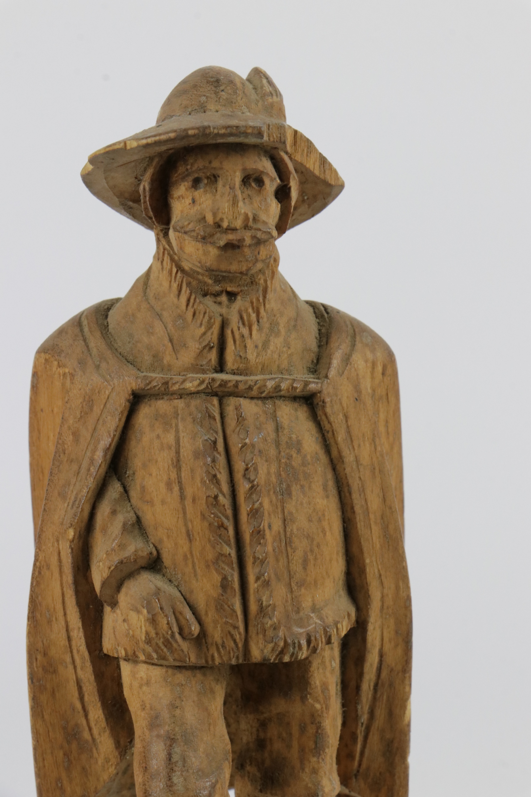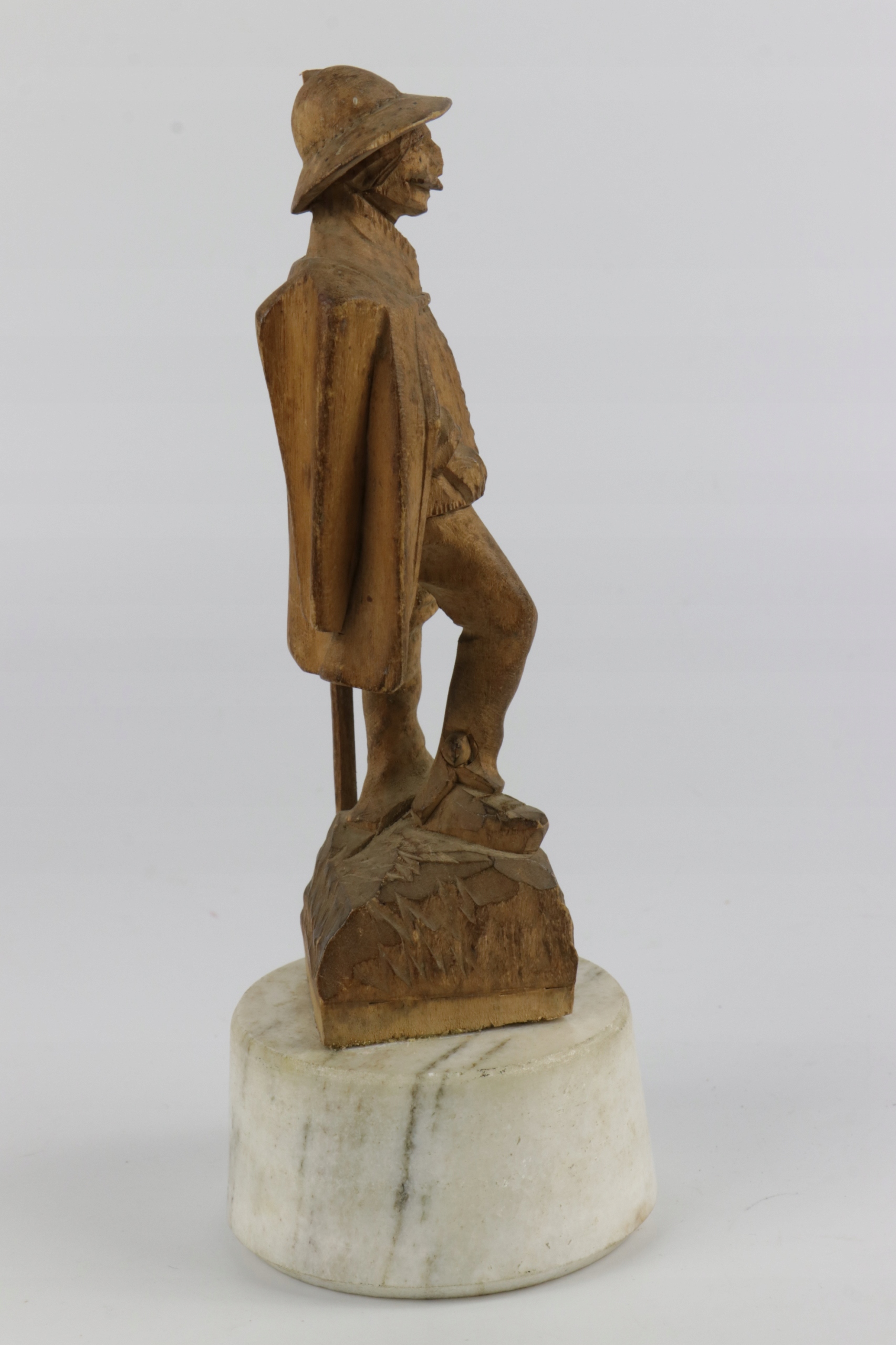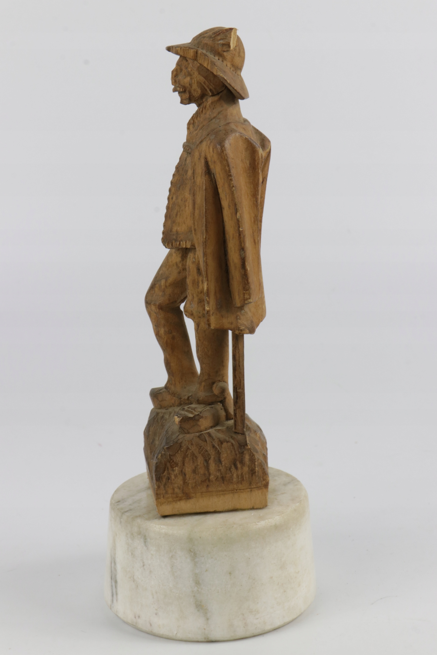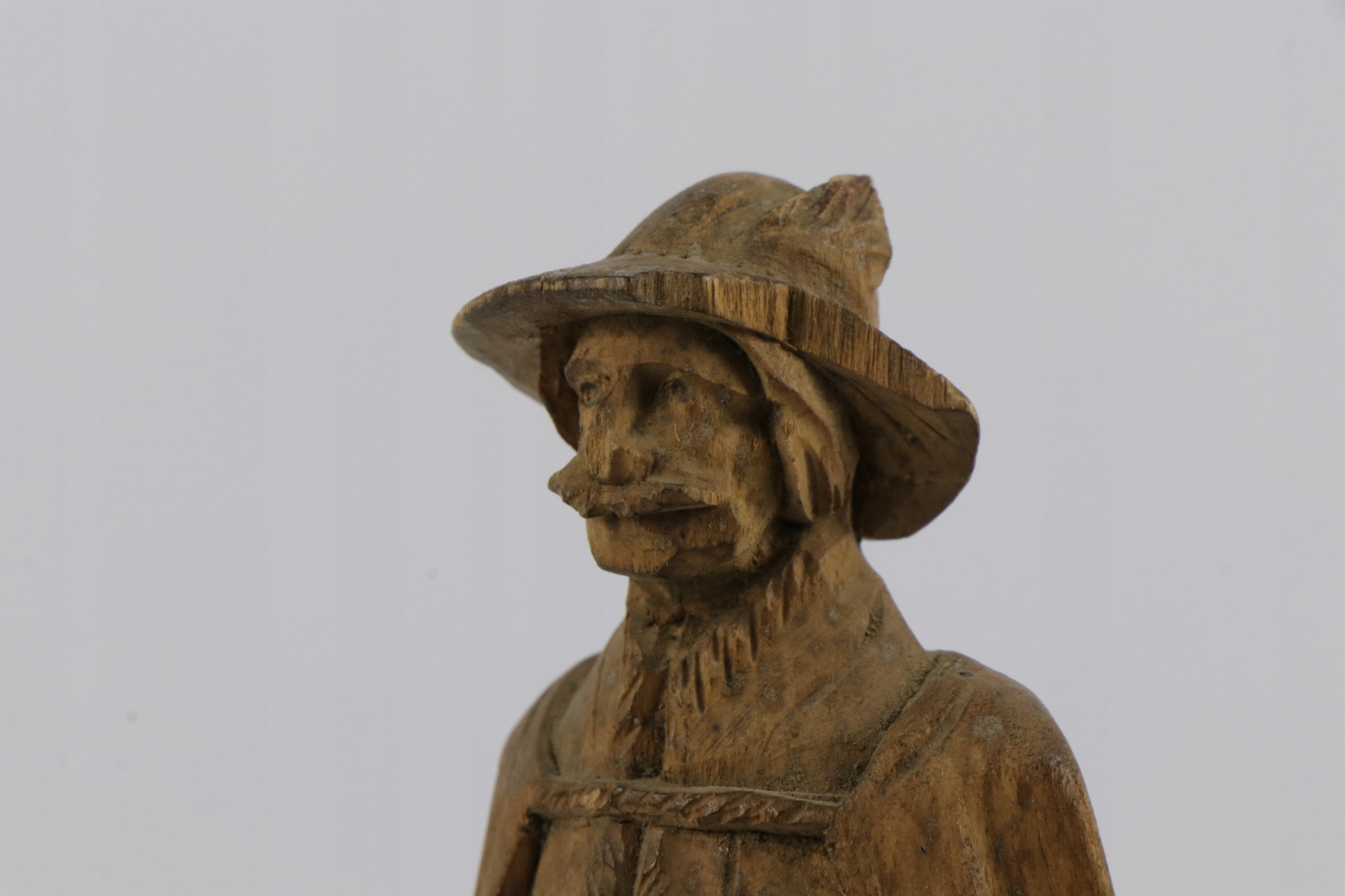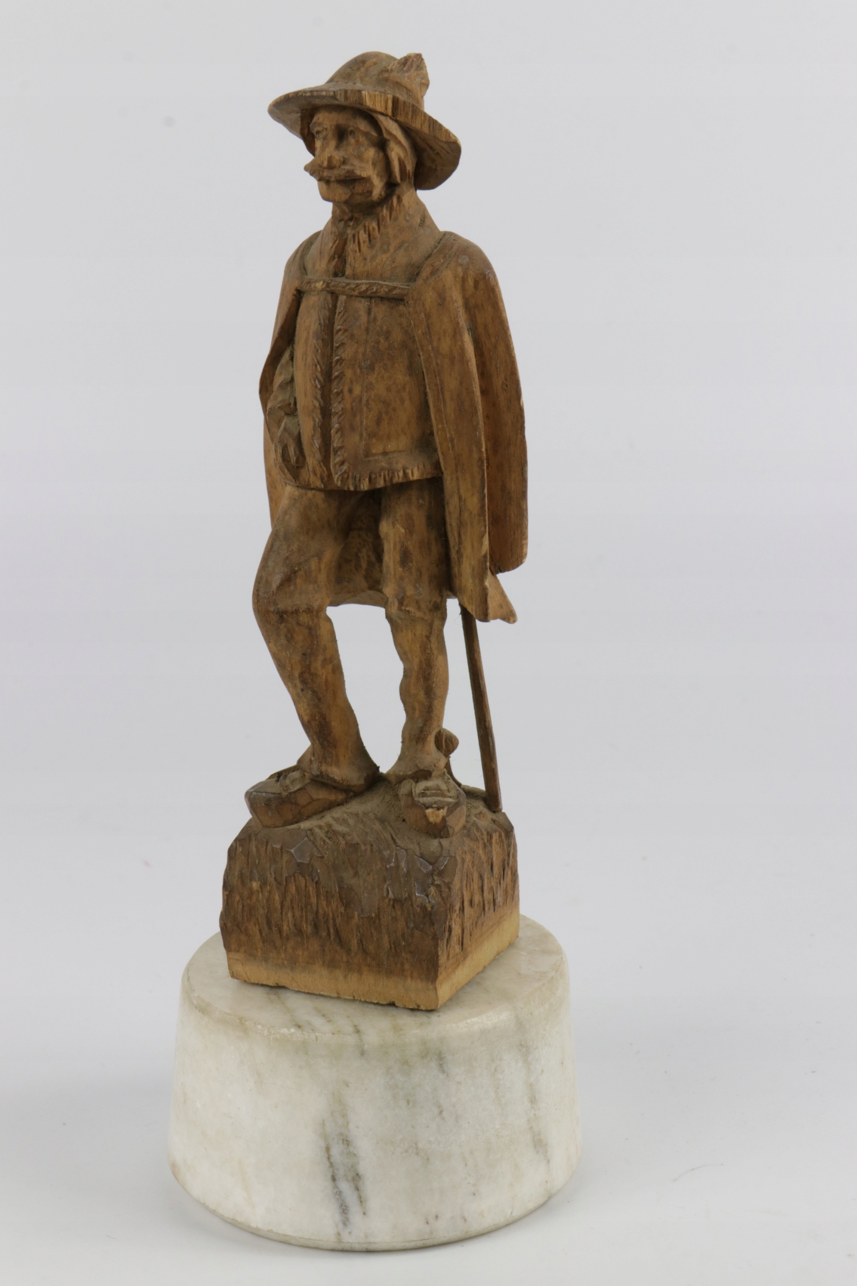 Старинная деревянная фигурка горца в традиционном горском народном костюме. Во-вторых, деревянная статуэтка, установленная на мраморном постаменте.