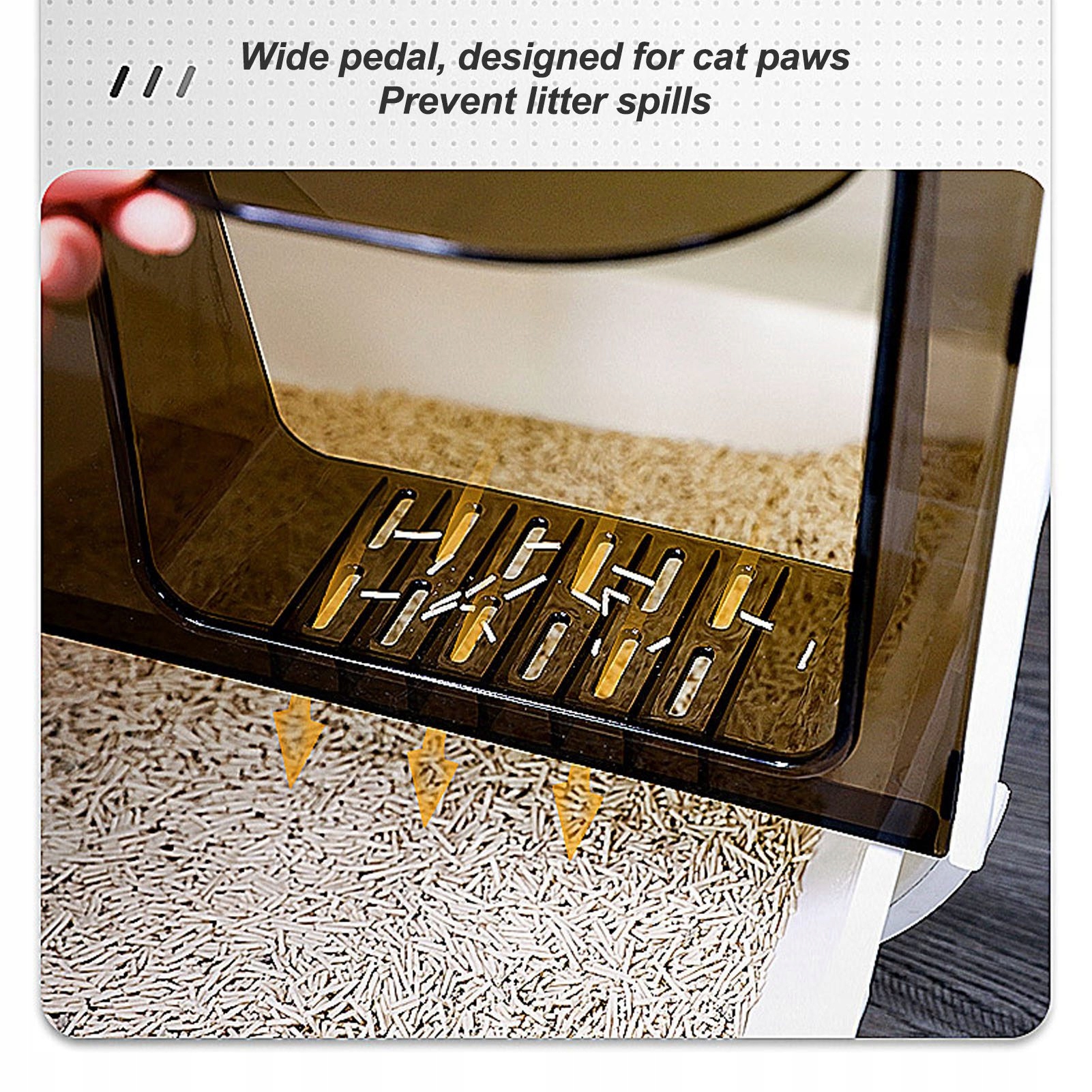 2. Удобный двойной дизайн входа: коробка имеет двойной способ раскачивания для кошек, чтобы свободно получить доступ к туалету. Вход оснащен пустой педалью, которая покрывает мульчу, когда кошка выпрыгивает, эффективно предотвращая разбрызгивание мусора и сохраняя пол и аккуратность.