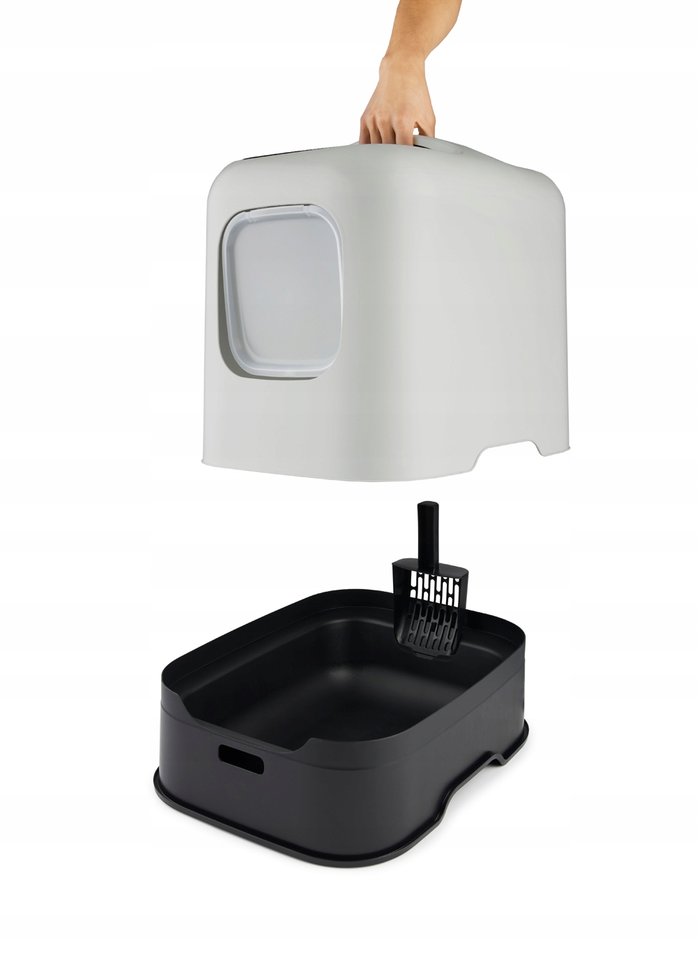 Современный крытый туалетный лоток с дверцей и совком.