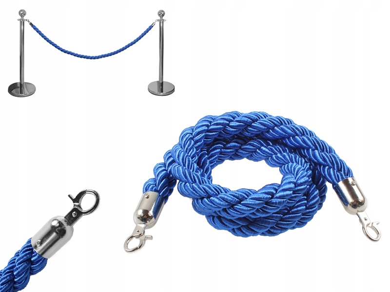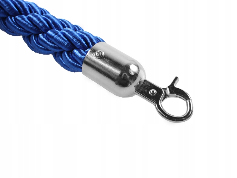 Синяя плетеная веревка для барьерных столбов. Карабины, установленные на концах веревки, позволяют быстро и легко прикрепить ее к стойкам отеля.