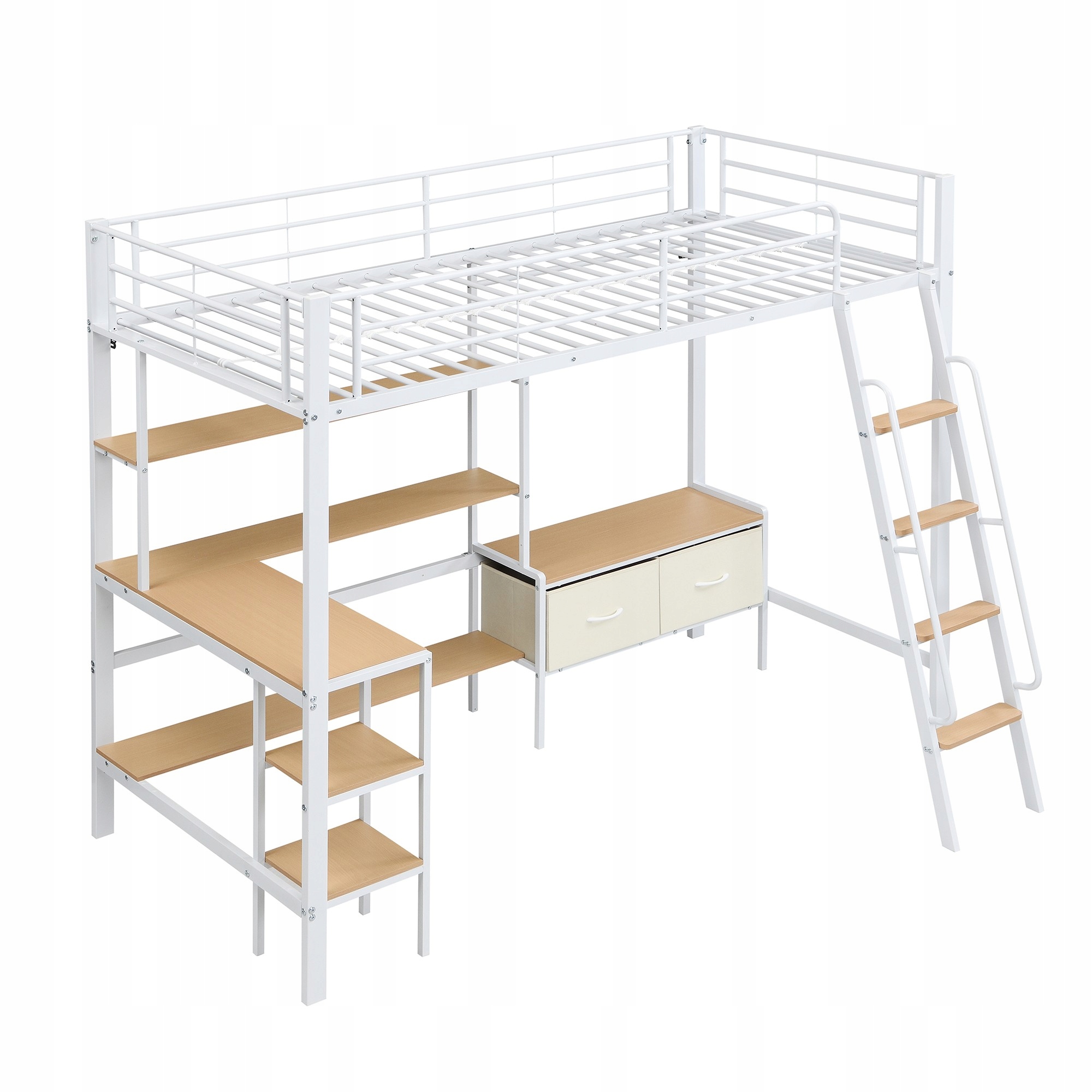 Железная двухъярусная кровать, детская кровать, письменный стол, полка, лестница 90х200см белый