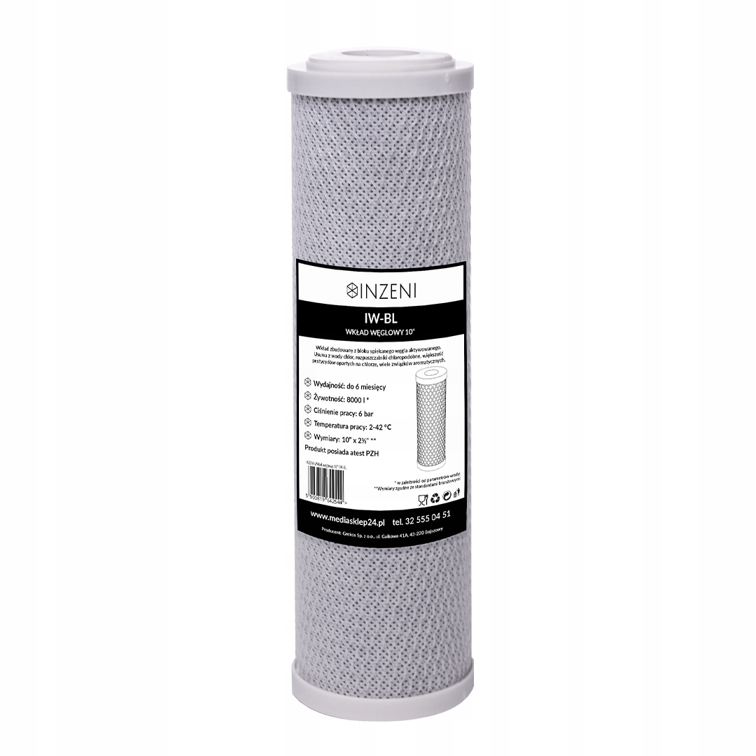 Картриджи серии Inzeni IW-BL содержат специальный активированный спеченный уголь с высокой адсорбционной способностью к хлору и другим летучим органическим веществам, содержащимся в воде. Они особенно рекомендуются для систем под мойкой и обратного осмоса. Спеченный уголь имеет гораздо большую удельную поверхность и количество химически активных центров и, следовательно, примерно на 25% более высокую эксплуатационную эффективность по сравнению с углеродным гранулятом. Этот вид угля не может фильтровать механически загрязненную воду, поскольку засоряет активные центры углерода и снижает эффективность его фильтрации. Поэтому очистке воды угольными картриджами должна предшествовать механическая фильтрация (предпочтительно <= 20 микрон). Однако они очень подходят для удаления хлора из воды, содержащей коллоидные и органические вещества.