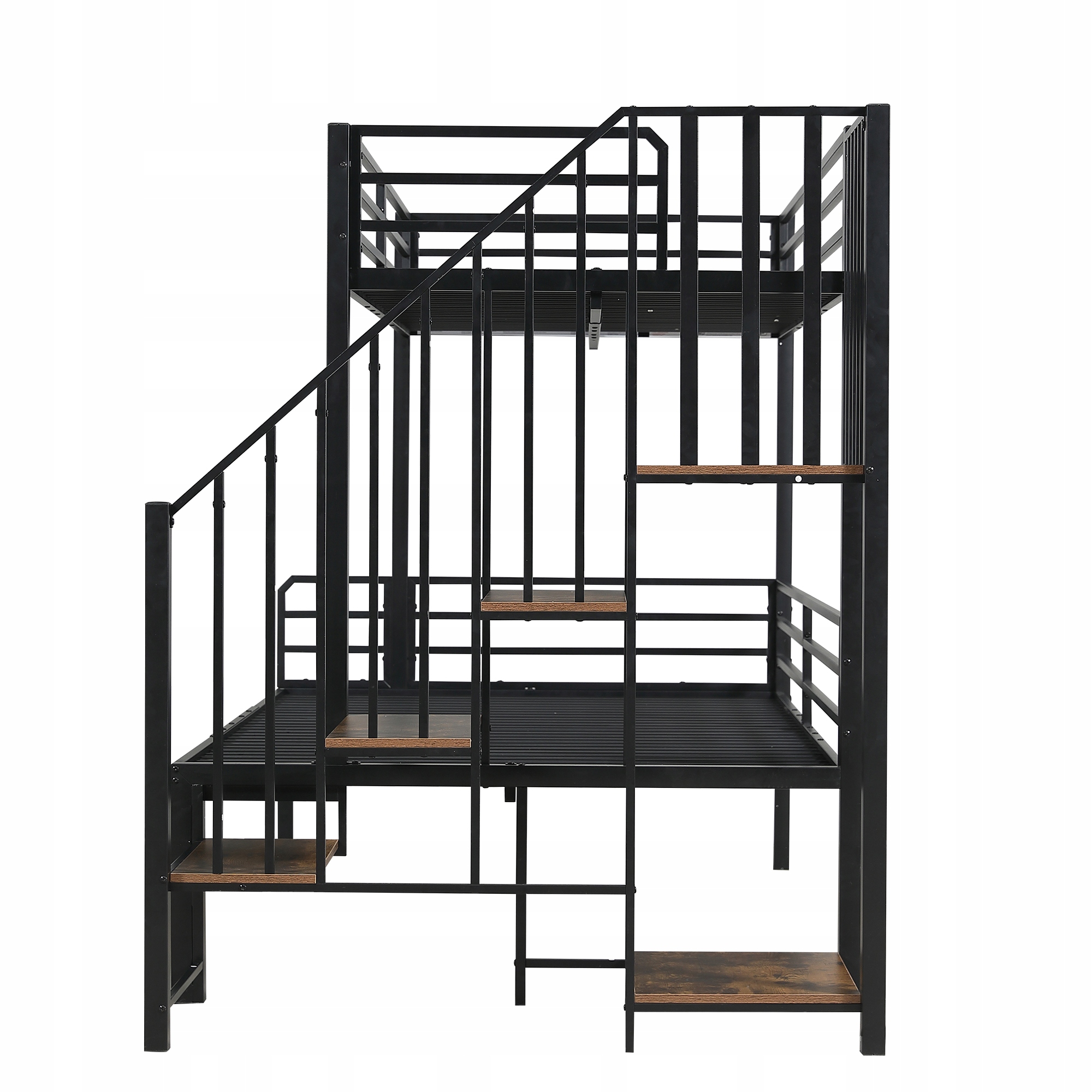 Железный кровать, койка, подходящая для детей и подростков, угловой лестничный шкаф с пространством для хранения, железо + MDF, черный цвет + винтажный дерево, 90x200 см и 120x200 см