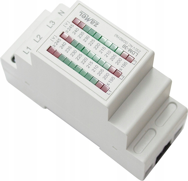 Индикатор напряжения LDM30 используется для графического представления уровней фазового натяжения в трехфазной сети. Значение напряжения обозначено тремя светодиодными линиями, состоящими из 11 светодиодов. Диапазон показаний составляет от 195 до 245 В ~ для каждой фазы. Индикаторная система питается из фазы L1, и ее недостаток полностью отключит устройство.