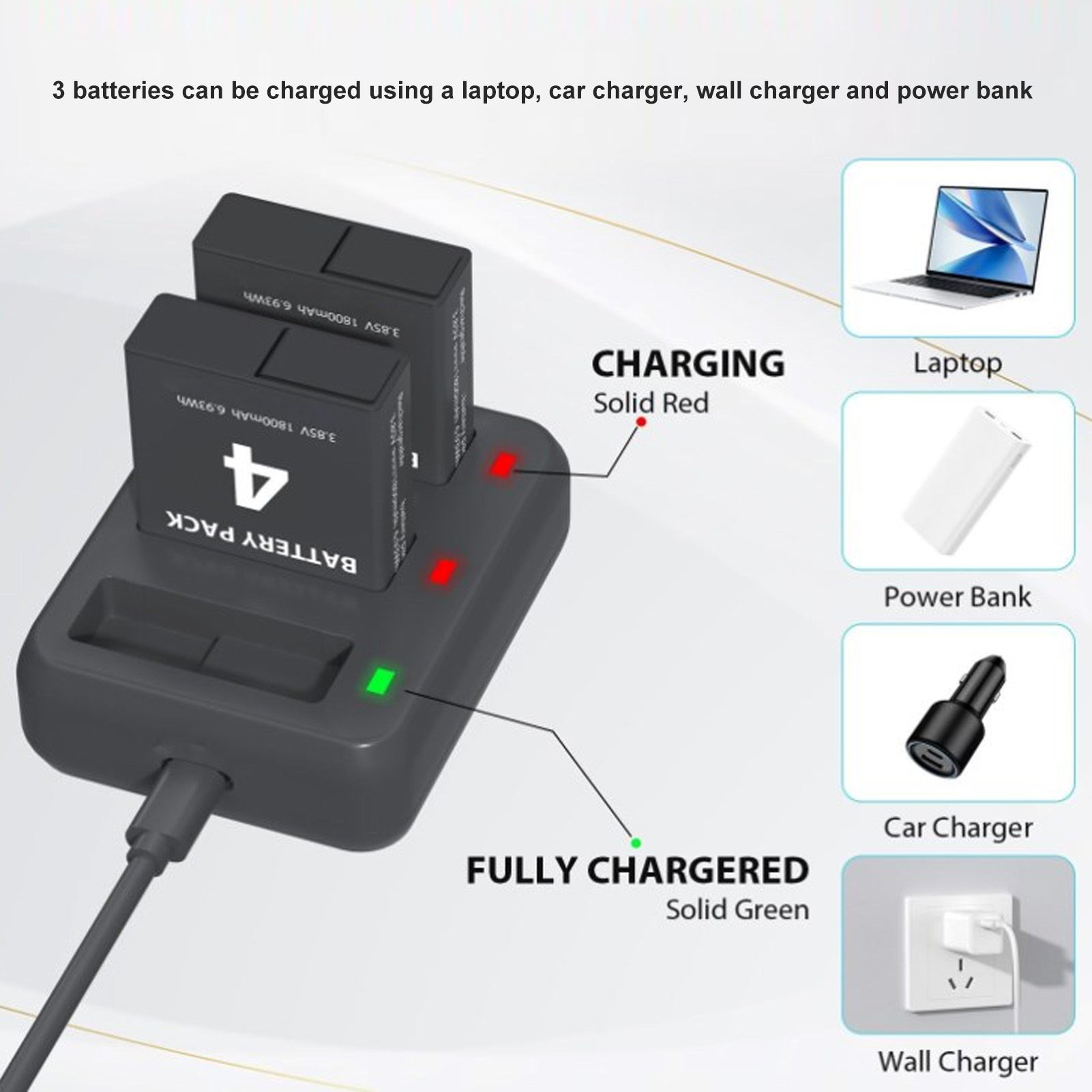 2. Быстрое зарядное устройство: зарядная станция с 3 слотами может заряжать 3 аккумулятора через устройства USB C (например, ноутбук, автомобильное зарядное устройство, настенное зарядное устройство и блок питания), а светодиодный экран отображает состояние зарядки аккумуляторов.