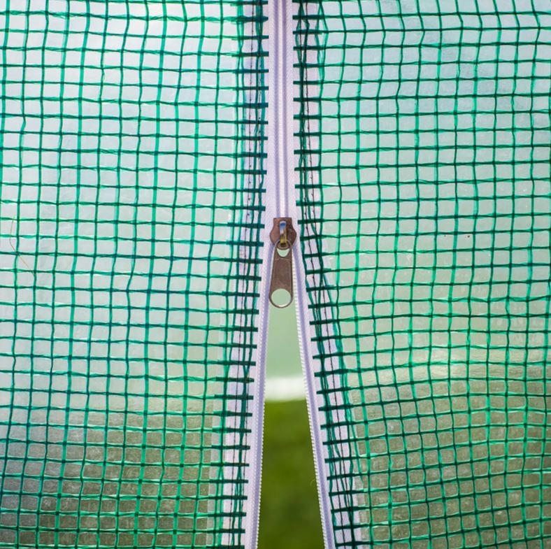 Теплица также имеет 6 окон (со стационарно установленной москитной сеткой), закрывающихся на липучки, которые можно прикрепить. открыть и выровнять температуру и влажность внутри теплицы. Москитная сетка ограничивает доступ жуков и насекомых внутрь теплицы.