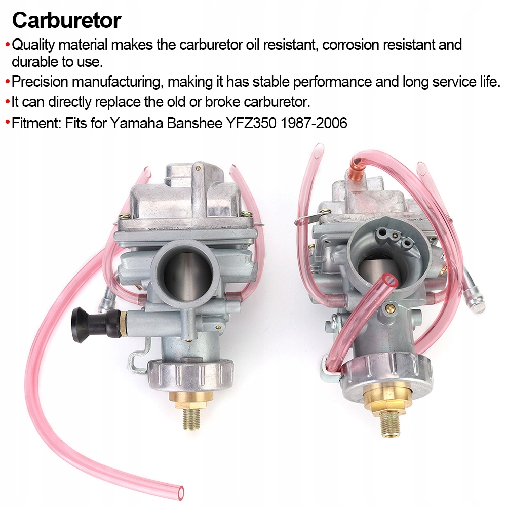 1. Высококачественный материал делает карбюратор маслостойким, устойчивым к коррозии и долговечным в использовании. 2. Точное изготовление обеспечивает стабильную работу и длительный срок службы. 3. Может напрямую заменить старый или сломанный карбюратор. 4. Простая и удобная установка, простота в использовании и 5. Практичный аксессуар подходит для Yamaha Banshee YFZ350 1987-2006 гг.