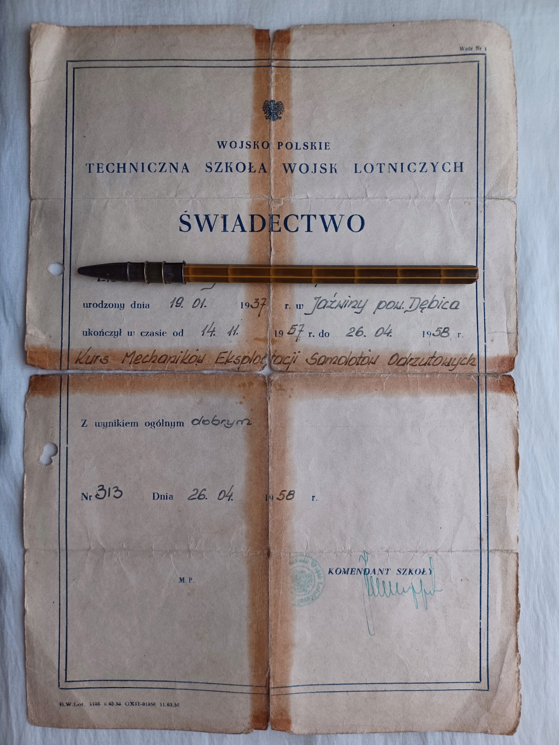 ZAMOŚĆ TECHNICZNA SZKOŁA WOJSK LOTNICZYCH WOJSKO POLSKIE ŚWIADECTWO 1958