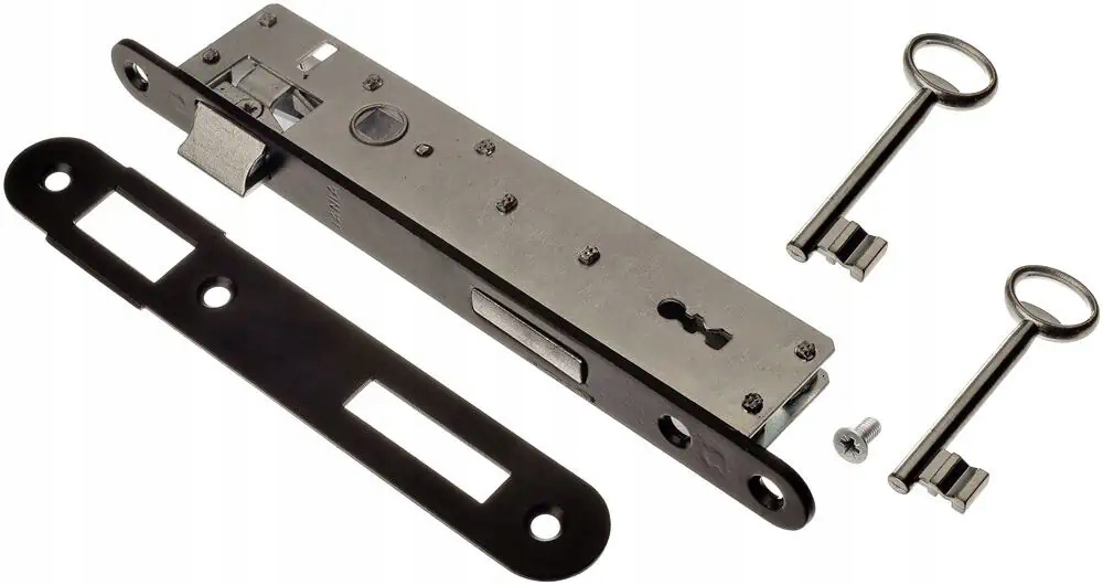 Характеристики: замок полностью изготовлен из белого оцинкованного листа с черной лицевой панелью, несъемный замок, на основе клепаных соединений, для использования в алюминиевых, металлических, пластиковых столярных изделиях и для ворот, ключевой вариант (два ключа в комплекте) и стандартная ручка со шпинделем 8 мм, У изделия надежный механизм - оно сделано добротно.