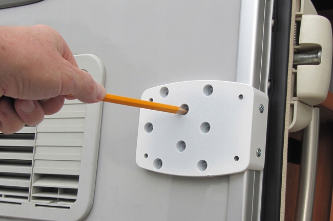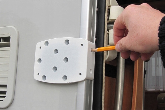 • Отметьте ручкой 4 отверстия на стене и два на внутренней планке или просто прижмите пластину к стене и просверлите отверстия. . Убедитесь, что стена внутри автомобиля не повреждена и в месте установки нет мебели.