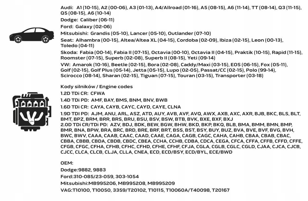 <ул>Амарок (10–16), Жук (02–15), Бора (02–08), Кэдди/Макси (03–15), EOS (06–15), Fox (05–11), Гольф (02) -15), Гольф Плюс (05-14), Джетта (05-15), Лупо (02-05), Пассат/СС (02-15), Поло (99-14), Сирокко (08-14), Шаран (02-15), Тигуан (07-15), Туран (03-15), Транспортер (03-18)
