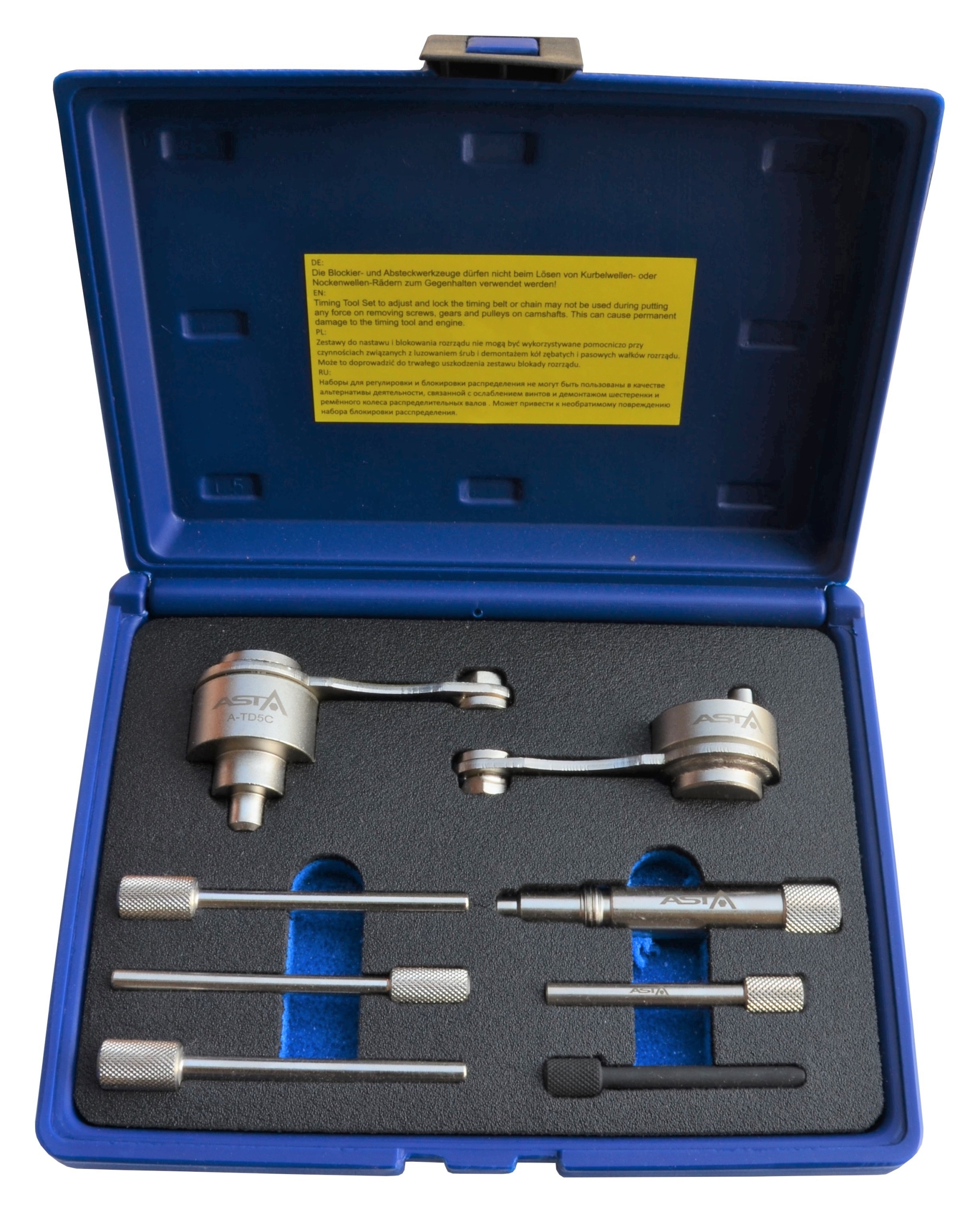 В комплект входят установочный штифт распределительного вала, инструменты для блокировки маховика, стопорный штифт насоса охлаждающей жидкости и зажим ремня ГРМ.