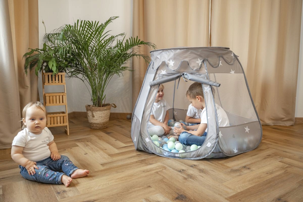 Набор В комплект входит: палатка/замок и 100 шариков следующих цветов: жемчужный, серый, прозрачный, пудрово-розовый.