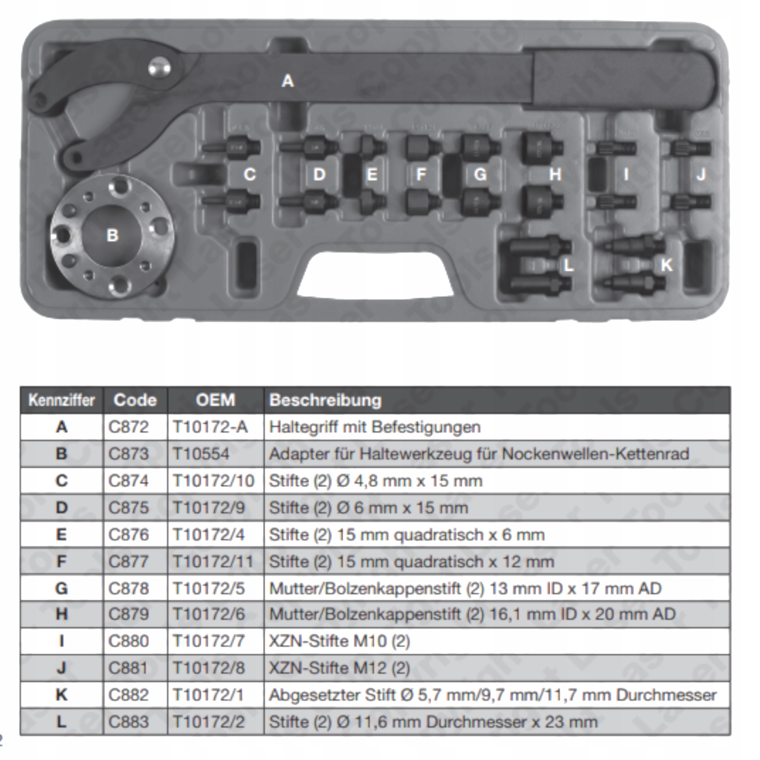 Специализированные инструменты позволяют установить фазу газораспределения в верхнюю мертвую точку, снять/установить распределительный вал, заменить ремень ГРМ, масляный насос, гаситель вибрации, проверить регулировку распределительного вала и заблокировать коленчатый вал.