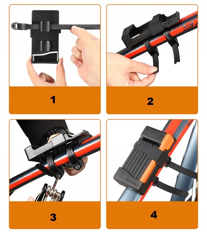 Велозамок West Biking можно установить разными способами. Специальный держатель позволяет закрепить его на флягодержателе вместо флягодержателя или на раме или подседельном штыре с помощью специальных ремней.