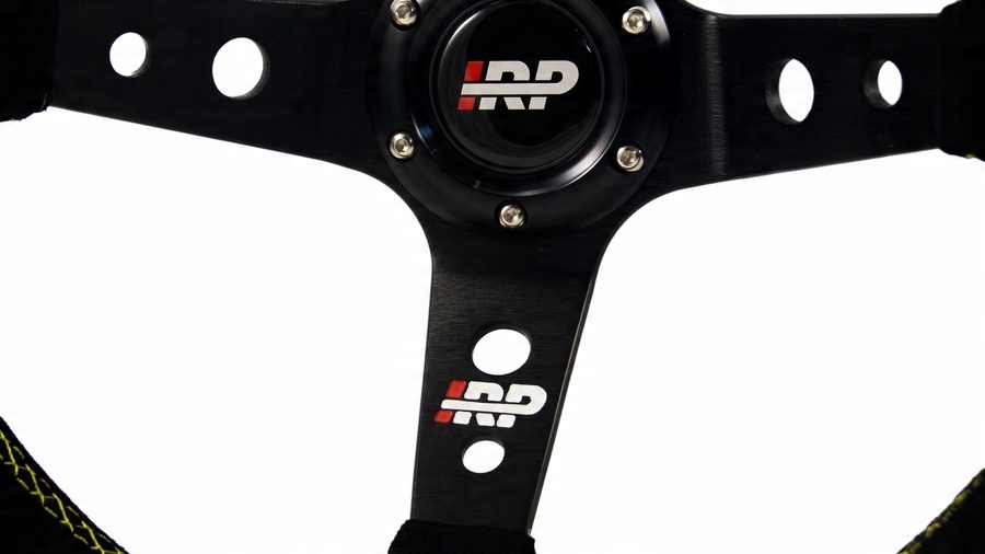 Руль IRP с желтой полосой и желтой окантовкой изготовлен из высококачественного алюминия, покрытого замшевой кожей.