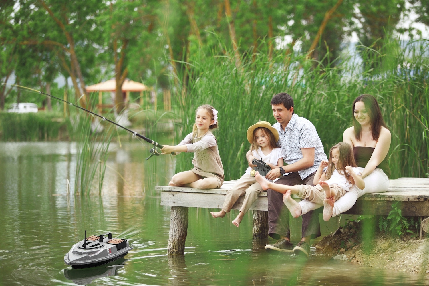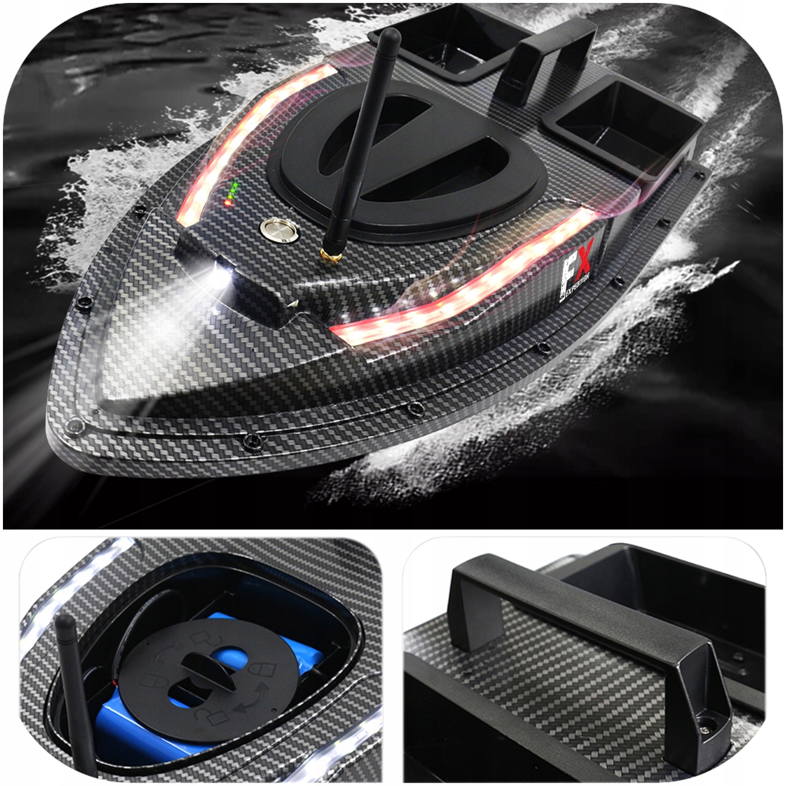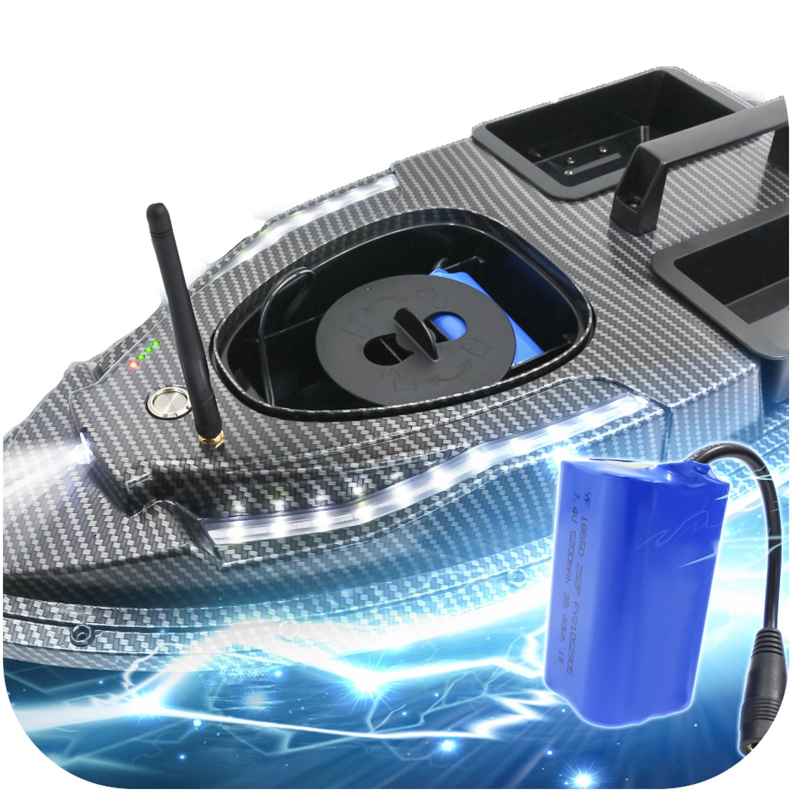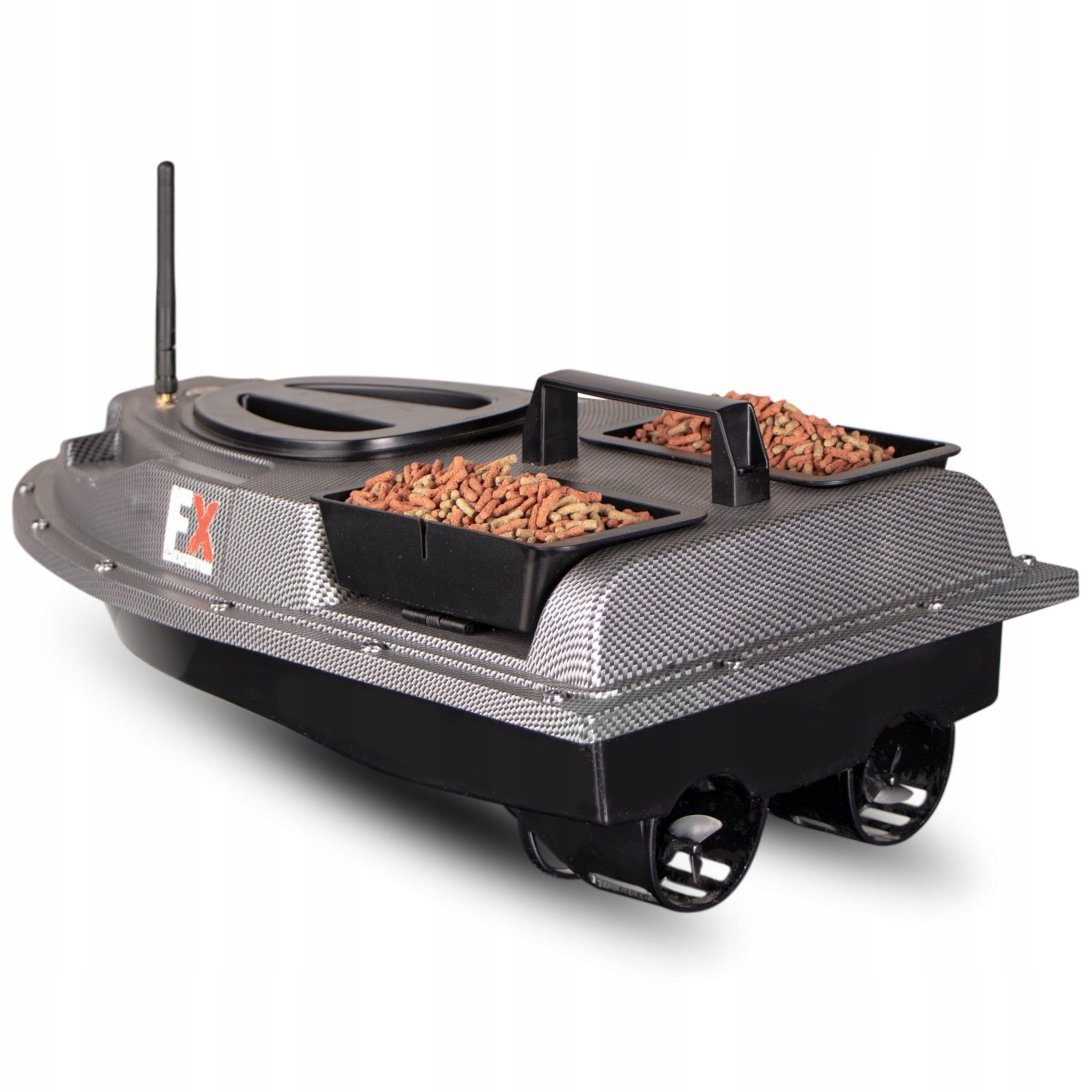 Лодка имеет два резервуара, которые вмещают в общей сложности до 1,5 кг прикормки и привлекают косяк рыбы. Вы можете управлять танками по отдельности. Дополнительно в кормовой части лодки имеется специальное место для крепления крючка с наживкой. Имея хорошее оснащение, вы легко сможете убедить рыбу, что ваш крючок — лучшая еда.