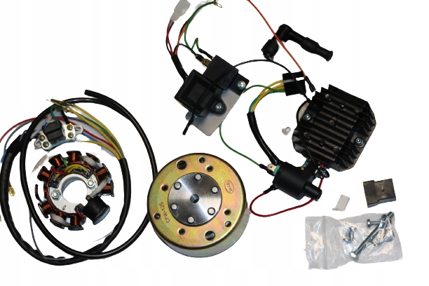 Зажигание для мотоциклов MZ ETZ 125 150 Мощность зарядки 200 Вт (3 ФАЗЫ, ГЕНЕРАТОР) номинальное напряжение 12 В Диаметр магнитного колеса 110 мм Вес магнитного колеса 820 г В комплект НЕ входит модуль индикатора зарядки. Исполнение: - ступица магнитного колеса изготовлена на станках с ЧПУ, из стали, покрытой слоем гальванического цинка; ступица интегрирована с экстрактором колеса (экстрактором служит винт М10 - вкручивая винт в ступицу, снимаем магнитное колесо) - точеный канал для клина/фиксирующего штифта - так устроено основание что он идеально вписывается в исходное расположение генератора; лазерный прожог с точностью до 0,01 мм! - продуманный метод регулировки угла опережения зажигания МЫ ЕДИНСТВЕННЫЕ, кто предлагает зажигание для мотоциклов ETZ 125 и ETZ 150, позволяющее плавно регулировать опережение зажигания перемещением. магнитное колесо снимать не нужно, достаточно ослабить 2 винта, фиксирующих положение вала, и правильно установить угол опережения зажигания - подходящее расстояние между сердечниками катушки и магнитом достигается благодаря используемым проставкам, позволяющим. для увеличения мощности заряда и обеспечения посадки элементов - использован статор с 11 катушками, 10 из них генерируют ток, необходимый для питания всех электроприемников мотоцикла - каждый из электронных компонентов снабжен соединительными кубиками, благодаря чему соединение система проста и удобна - продуманный метод сборки элементов