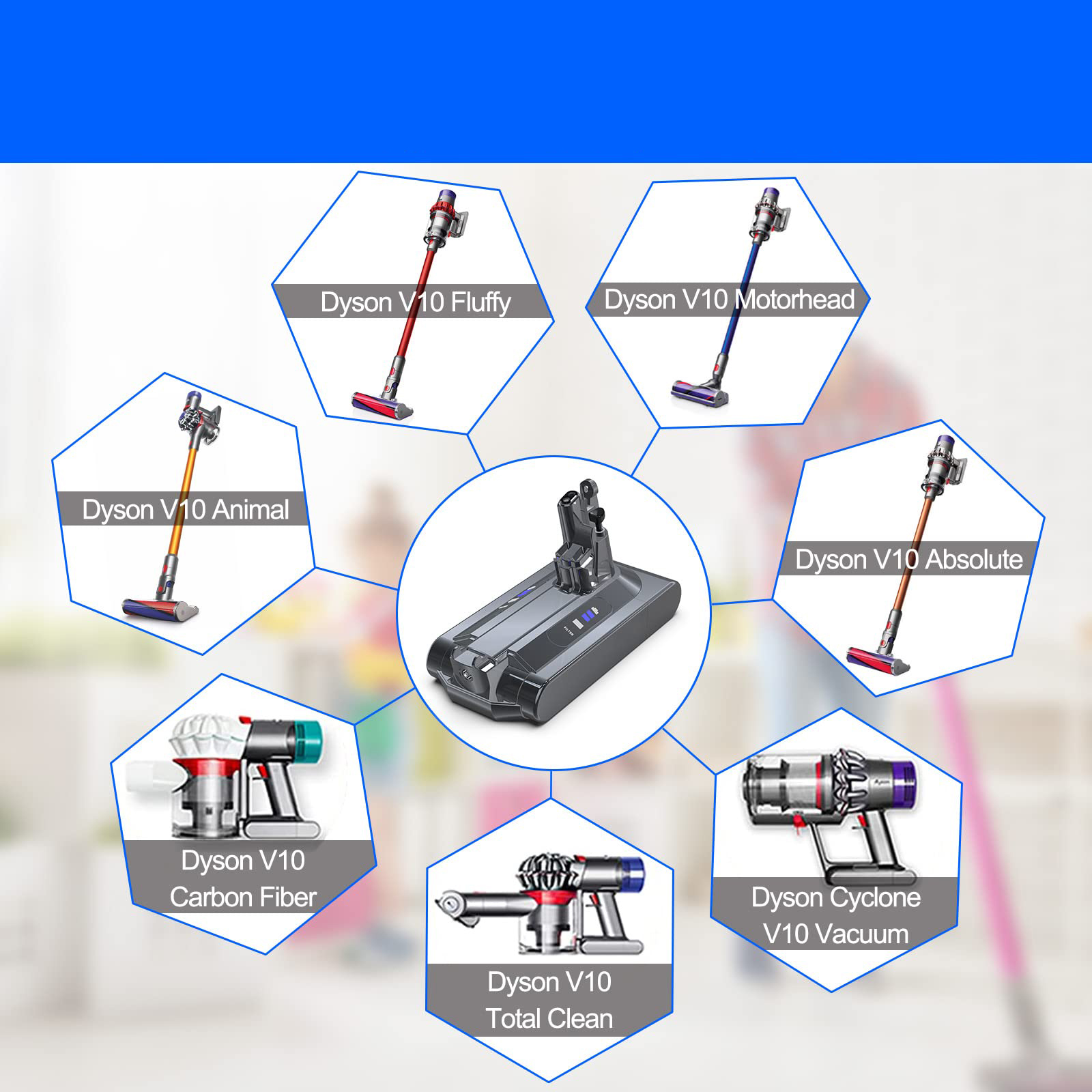 - СОВМЕСТИМОСТЬ: Замена батареи Dyson v10 идеально совместима с батареями Dyson Cyclone V10 Animal, V10 Absolute, V10 Motorhead, V10 Fluffy, OEM V10 и зарядными устройствами Dyson V10. (Недоступно для SV10)