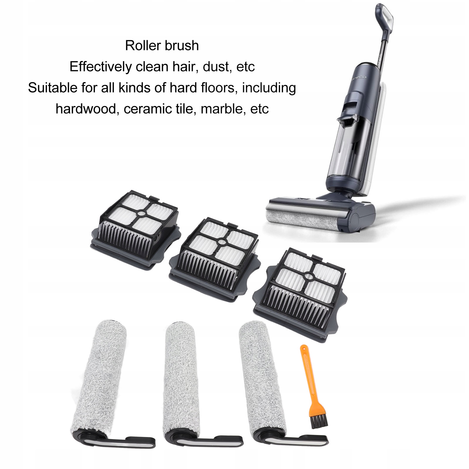 2. Мягкая роликовая щетка: роликовая вакуумная щетка изготовлена из мягких материалов и может использоваться для чистки различных твердых полов, включая паркет, плитку, мрамор и т. д. Эффективно очищает волосы, пыль и т. д.