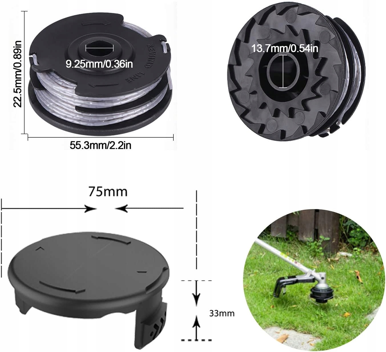Меры предосторожности: сильная центробежная сила и быстрая резка при использовании. Рекомендуется носить защитные очки и длинные брюки, чтобы избежать ненужных травм. Эта запасная насадка для беспроводного триммера подходит только для мелкой травы.