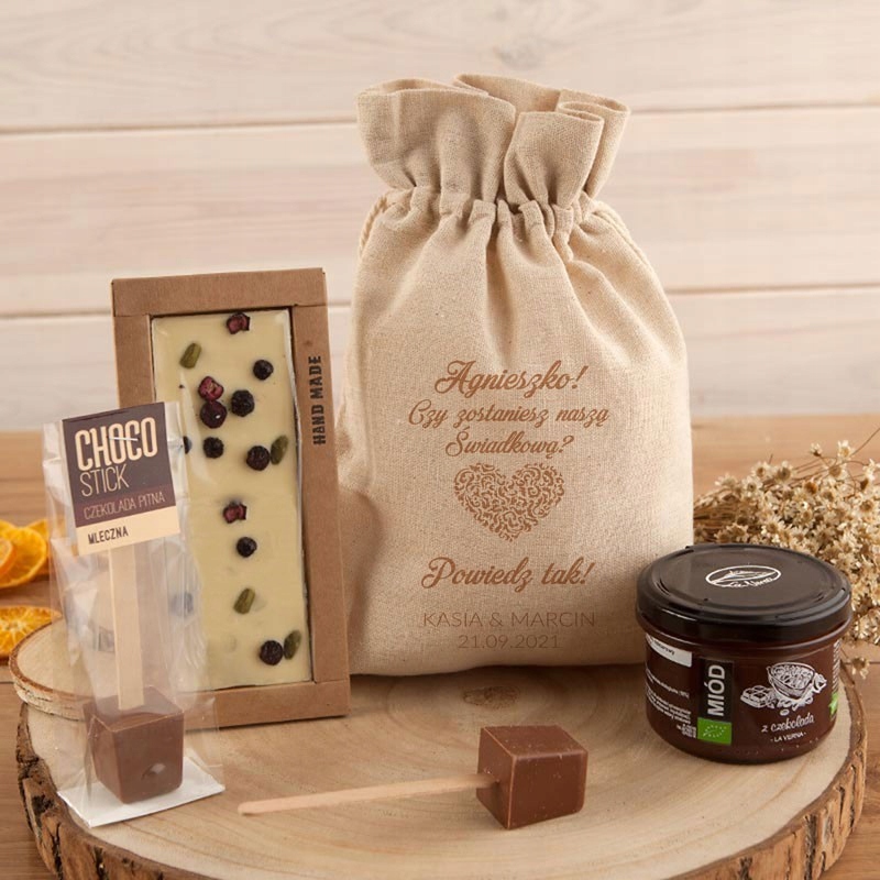 Просьба о свидетеле или красивый запрос о том, как быть Свидетелем, в естественном стиле. Набор натуральных, экологических ингредиентов, помещенный в льняной мешочек, — прекрасная идея для вопроса о том, чтобы стать Свидетелем. В набор входит мед высшего сорта с шоколадом, шоколадная палочка, медовая палочка и шоколад ручной работы с фисташками. Все это выглядит красиво и оригинально.