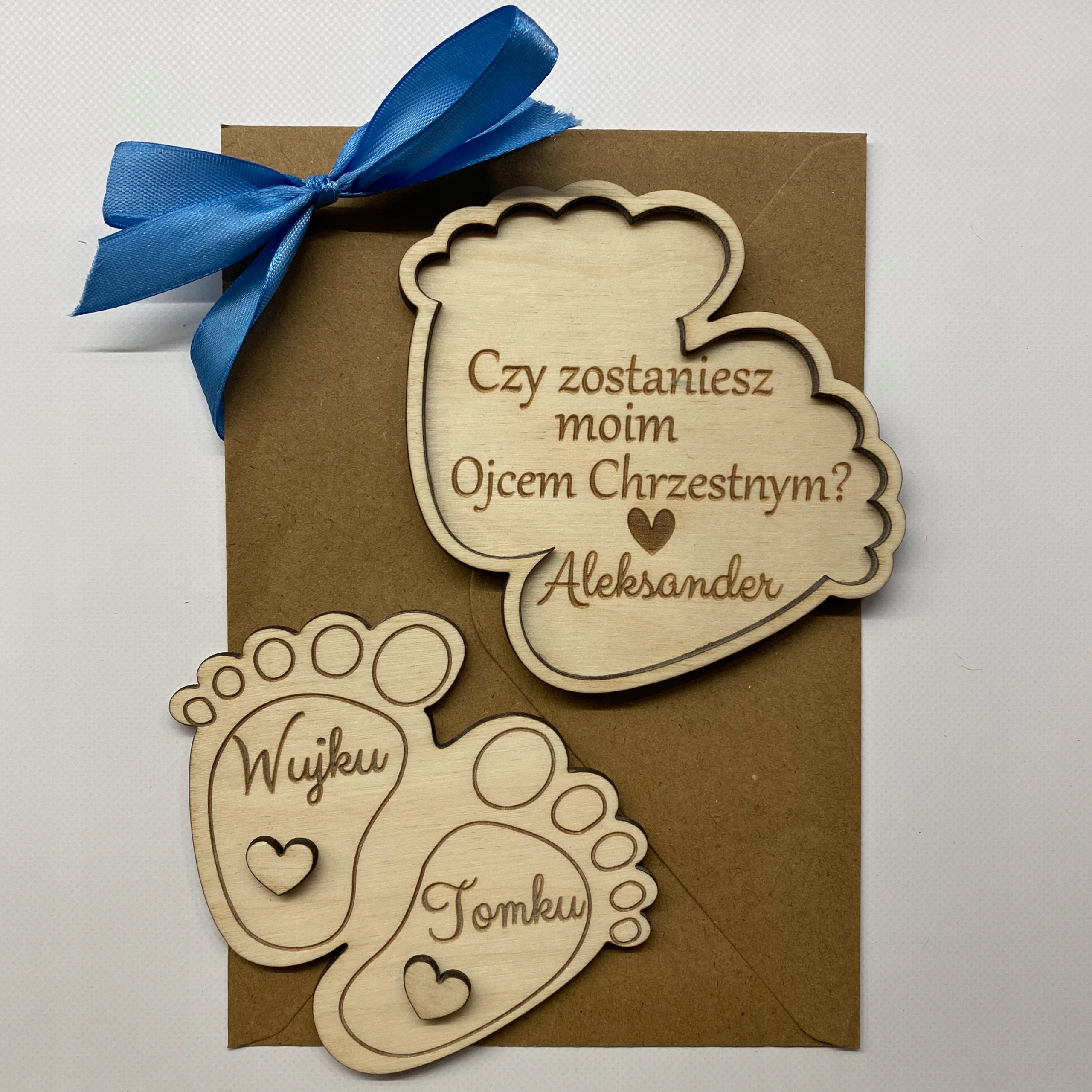 - 1 х Деревянная пригласительная открытка (размер ножки примерно 10 х 10 см) «С именной надписью (укажите имена крестных родителей) например, «Тетя Каролинка», «Дядя Марцин» и т. д.