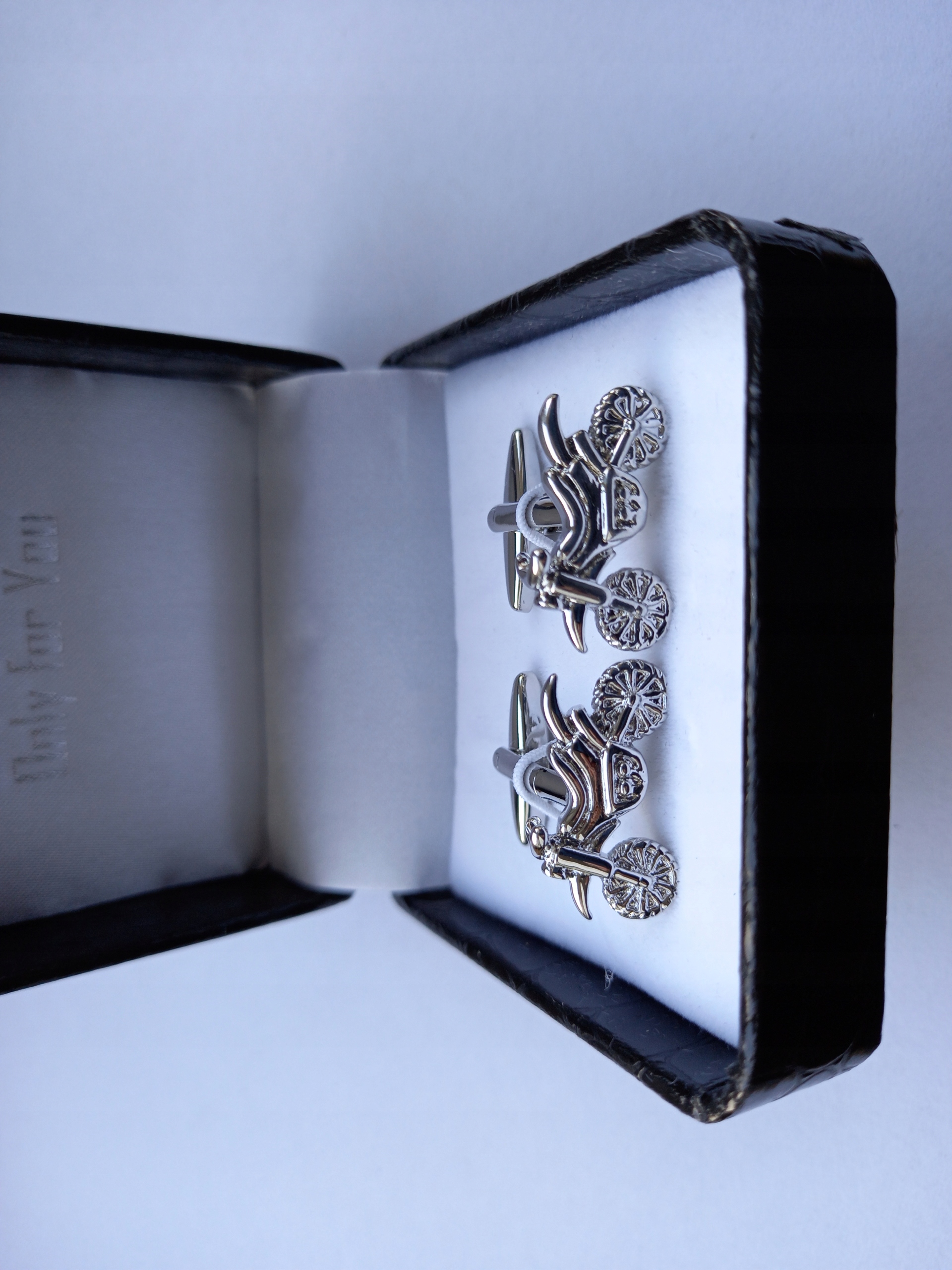 Художественные серебряные запонки для рубашек ручной работы в форме мотоцикла повышенной проходимости, так называемые Крест. Запонки изготовлены из драгоценного металла серебра. Пара запонок упакована в эксклюзивный футляр Exciting с рисунком змеиной кожи снаружи и атласной тканью и надписями «Только для тебя» специально для вас внутри.