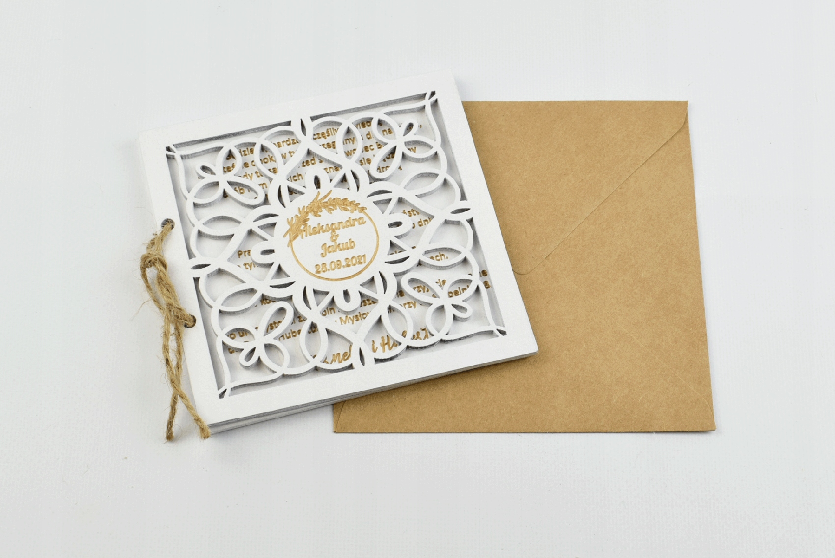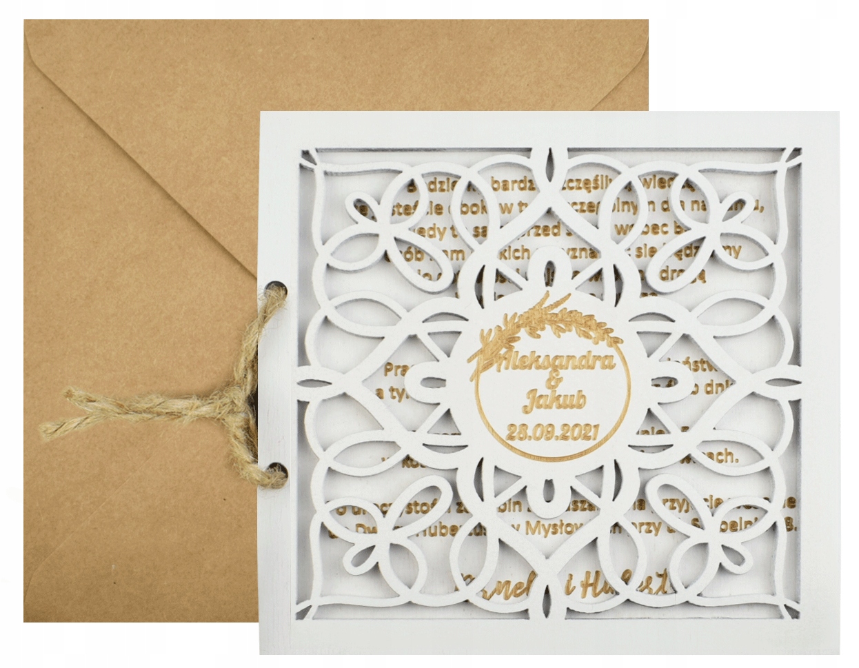 Приглашение в виде деревянной открытки станет идеальным способом подчеркнуть значимость приглашенных гостей – самых главных, то есть родителей.