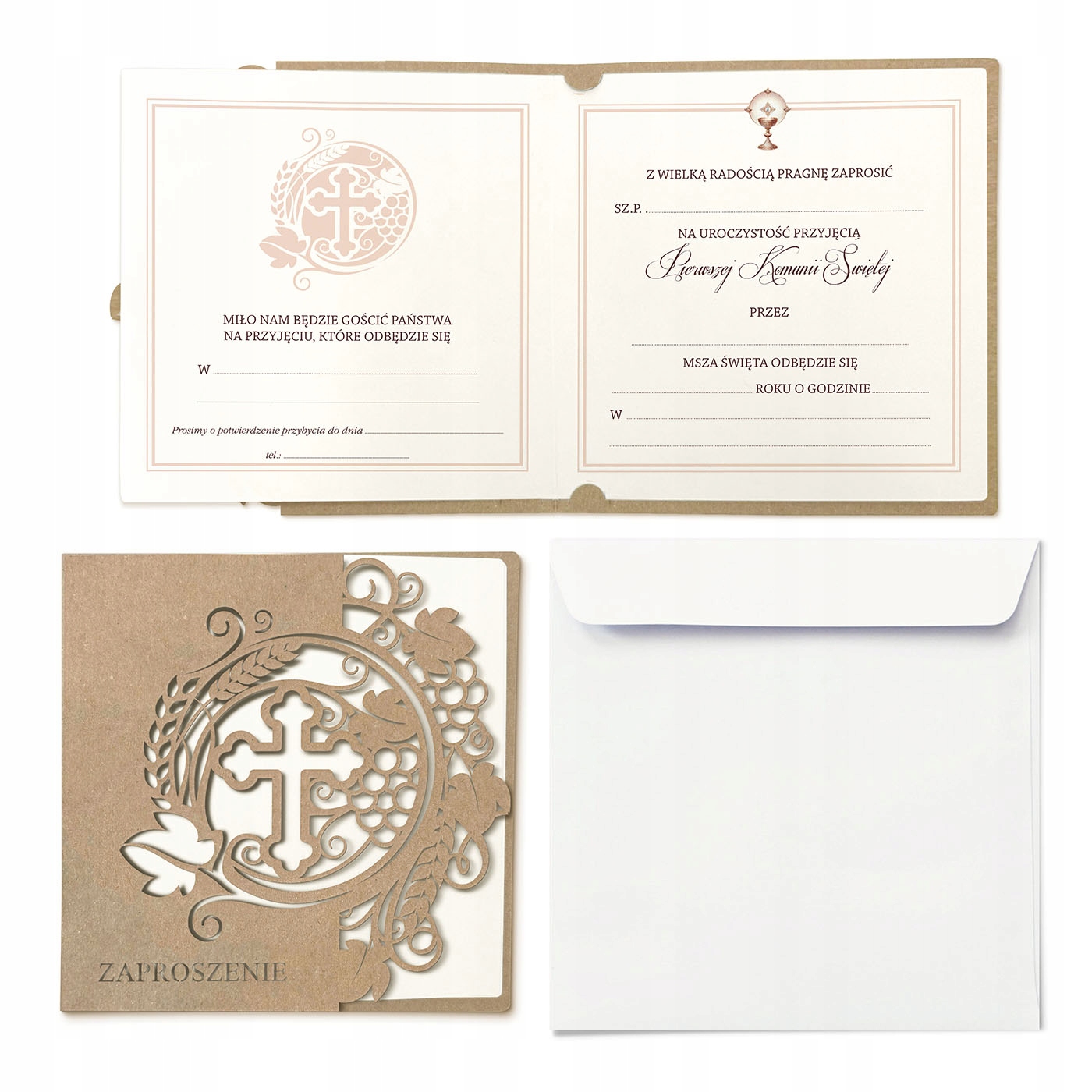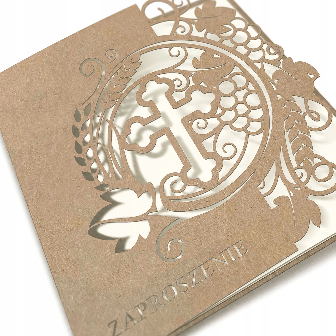 Приглашение к первому святому причастии, сделанного из экологической статьи, является не только элегантным способом подчеркнуть уникальность того дня, но и сознательный выбор с защитой окружающей среды. увольнять. Обложка украшена точным вырезанным мотивом креста и орнаментом растения, создавая гармоничную композицию на крышке. Надпись в нижней части обложки также была вырезана лазер