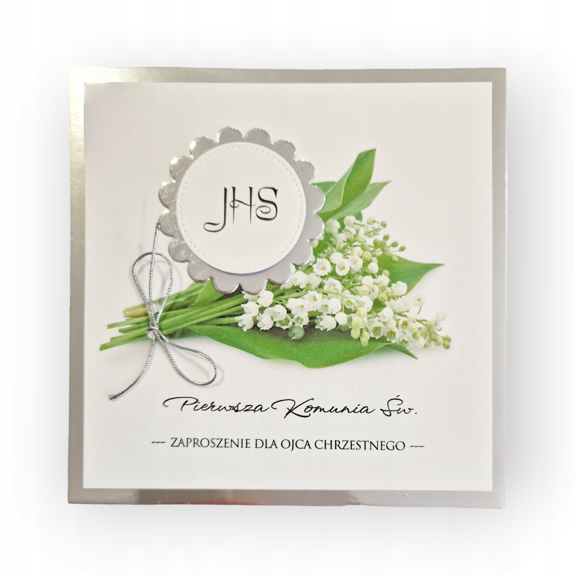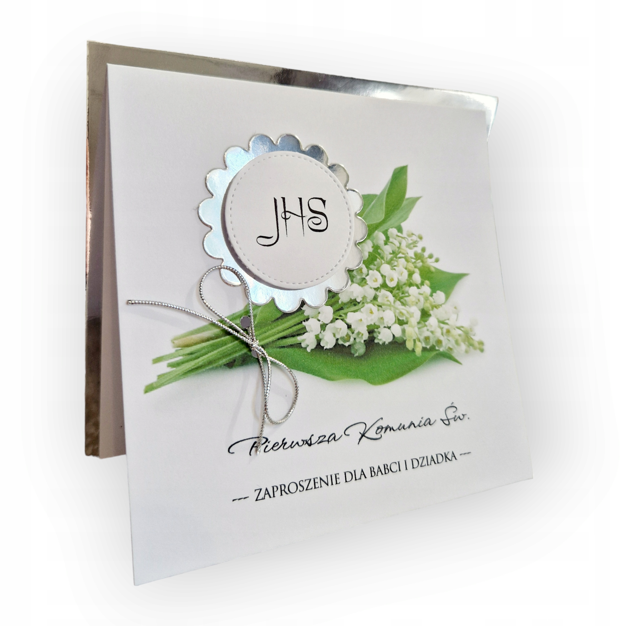 Украшение вокруг и вокруг надписи IHs IHS в серебряном цвете. Серебряный лук добавляет уникальность, которая очаровательно зажигает букет лилии долины.