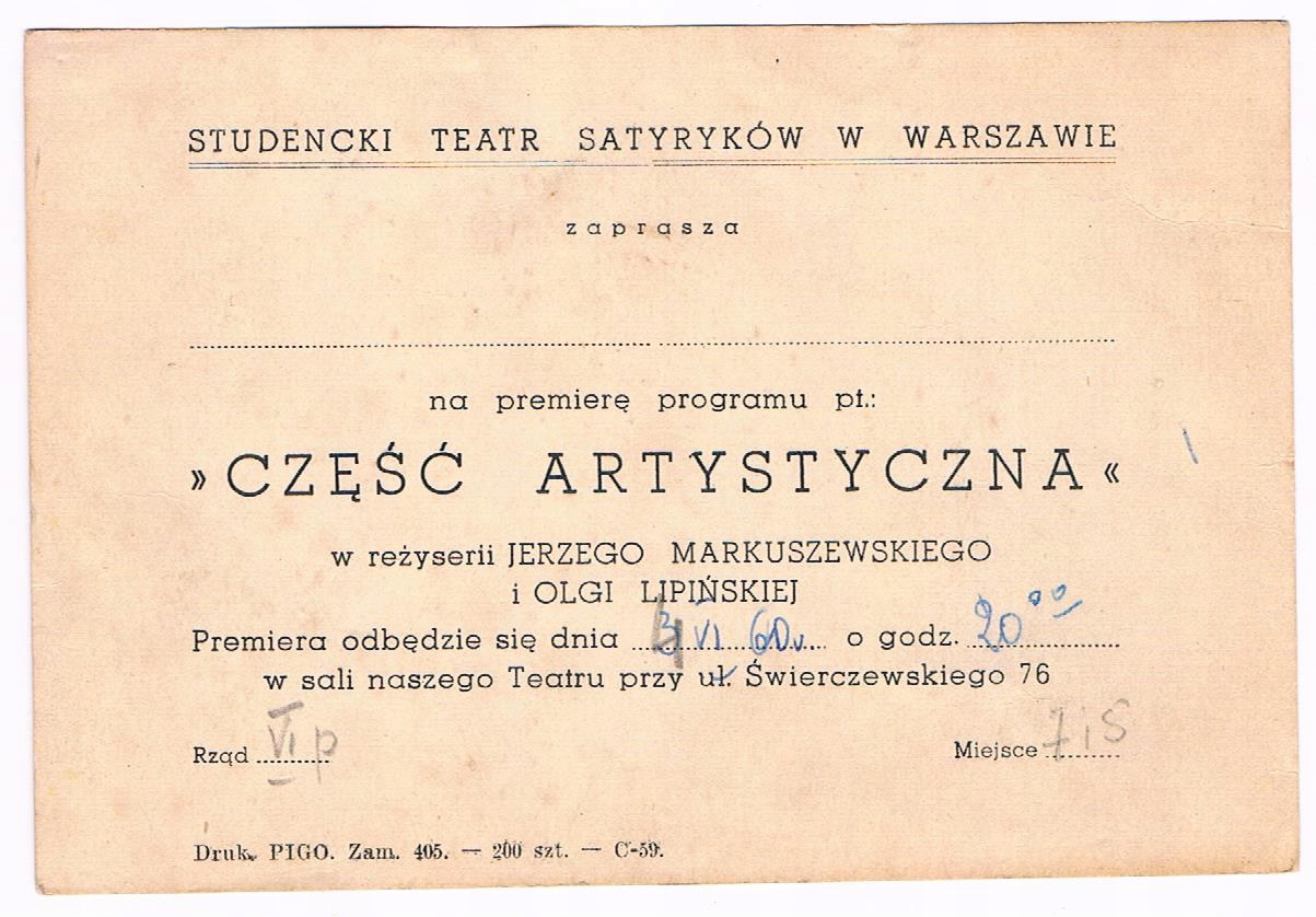 Студенческий театр Satirków для премьеры художественной программы, режиссерной Джери Маркушевски и Ольги Липиньской 4/06/1960 в театральной комнате в UL., Swierczewskiego 76, как на Scan