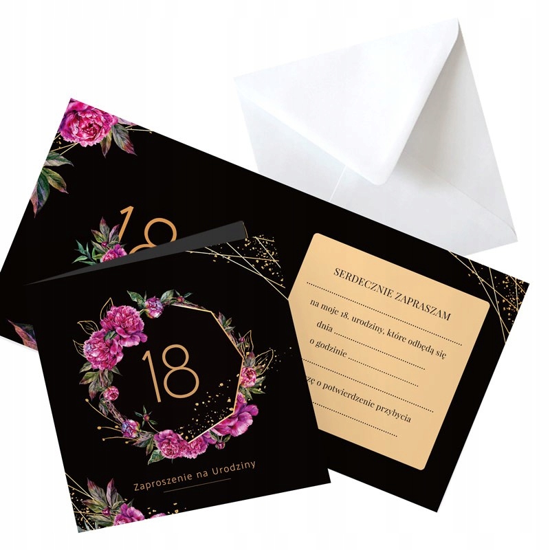 Красивые приглашения в стиле бохо с цветочным мотивом на черном фоне – идеальный выбор для празднования восемнадцатилетия! Благодаря высококачественной бумаге и печати приглашения будут выглядеть великолепно! В комплект входят одинаковые конверты. Внутри есть текст, который вы можете заполнить самостоятельно.