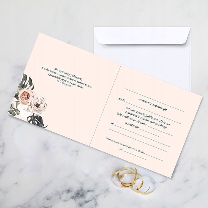 Элегантное приглашение на 25-летие свадьбы, изготовлено из немелованной бездревесной бумаги премиум-класса с высоким индексом белизны, обеспечивающей идеальный контраст текста и графики.
