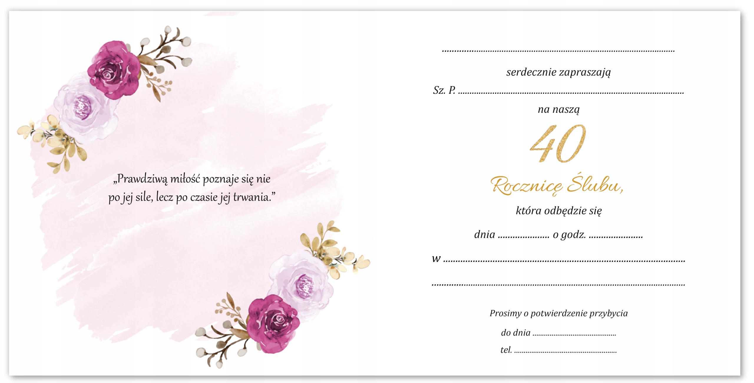 Просматривая «Приглашение на 40 -ю годовщину свадьбы с конвертом», вы можете быть уверены, что данный товар из каталога «[rubrica_name]» будет доставлен из Польши и проверен на целостность. В цене товара, указанной на сайте, учтена доставка из Польши. Внимание!!! Товары для Евросоюза, согласно законодательству стран Евросоюза, могут отличаться упаковкой или наполнением.
