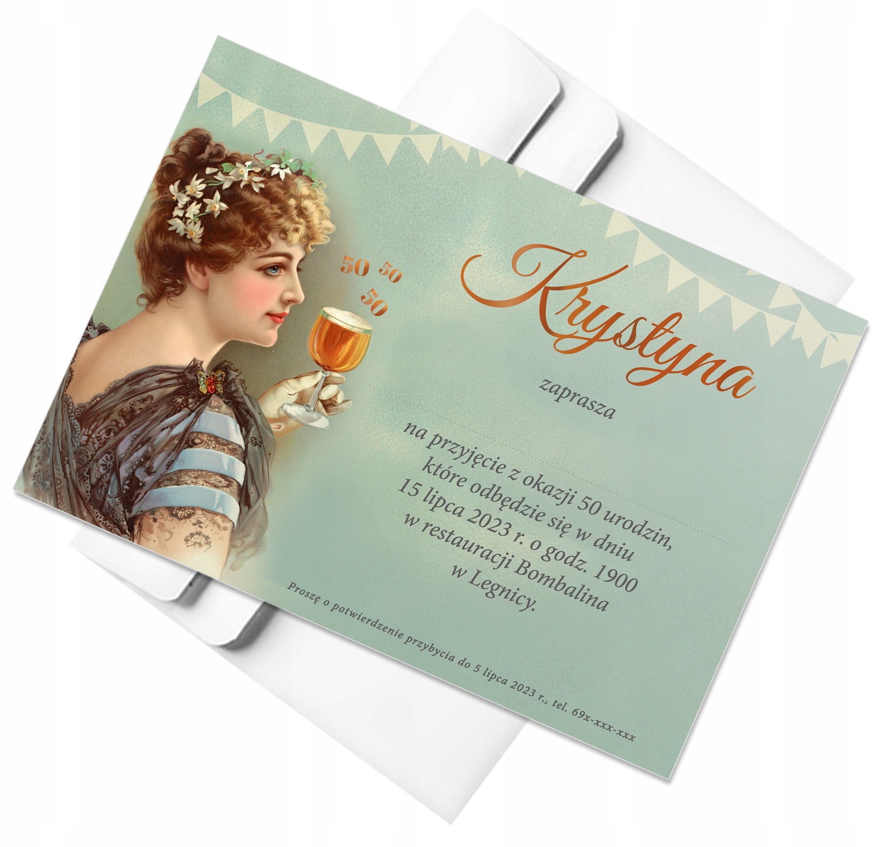 Приглашение на день рождения к 50-летнему юбилею с оригинальным рекламным изображением 1898 года, на котором изображена элегантная женщина, поднимающая тост.