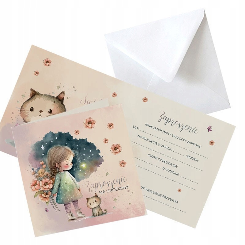 Приглашения на день рождения украшены чудесным изображением девочки с котенком. Это отличная, оригинальная идея, которая позволит вам пригласить маленьких гостей. Приглашения продаются упаковками по 10 штук плюс 10 белых конвертов.