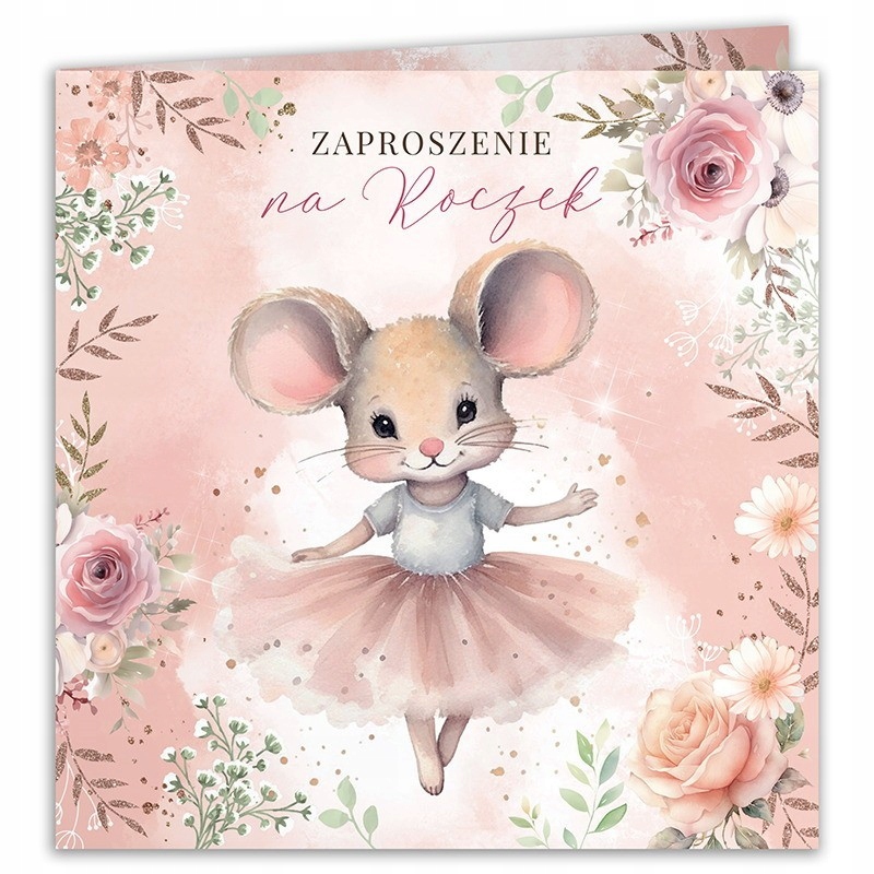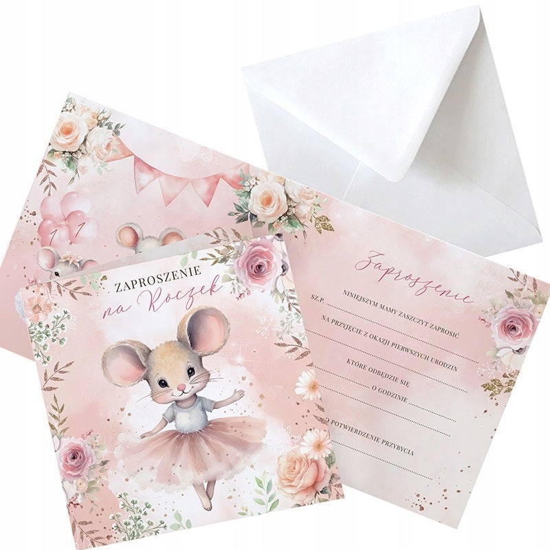 Красивые приглашения на день рождения девушке с мотивом мышки-балерины розового цвета. Закажите приглашения для написания самостоятельно, из плотной, качественной бумаги. Товар для саморазряда, продается в комплекте с белыми конвертами.