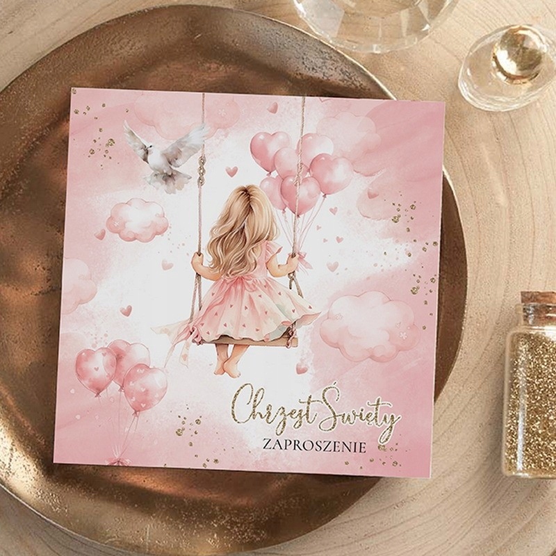 Приглашения на крещение для девочек, подготовленные для написания самостоятельно. Приглашения выглядят красиво и вне времени. Обложка украшена оригинальным мотивом девочки, качающейся на качелях. Акварельно-розовый фон делает прием приглашений нежным и легким. В комплект входят одинаковые белые конверты.