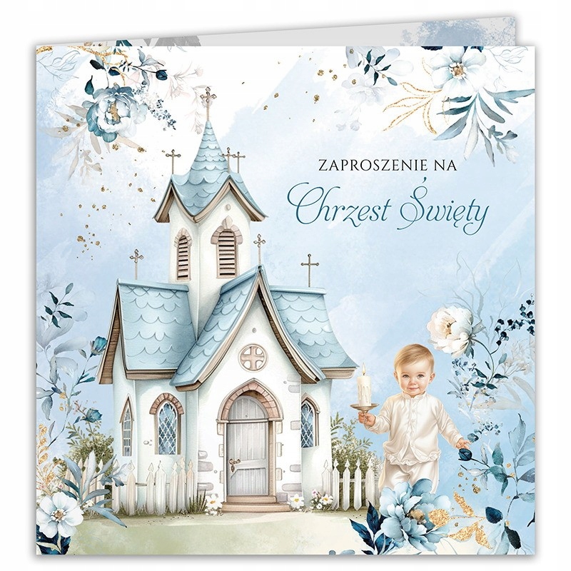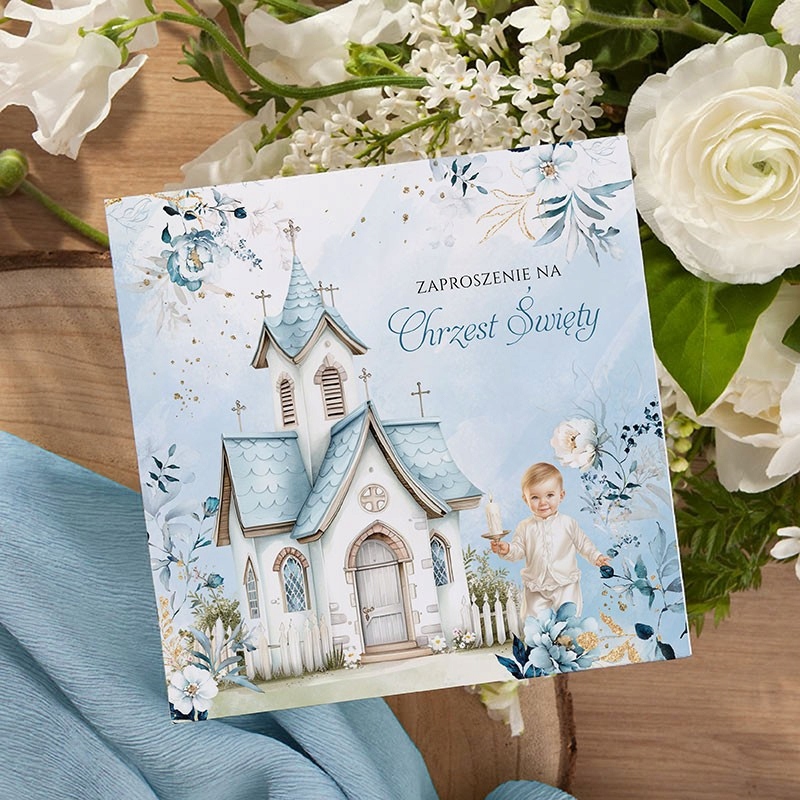 ЗАПРОШЕННЯ на хрещення хлопчика з синьою церквою 10шт (+конверти)