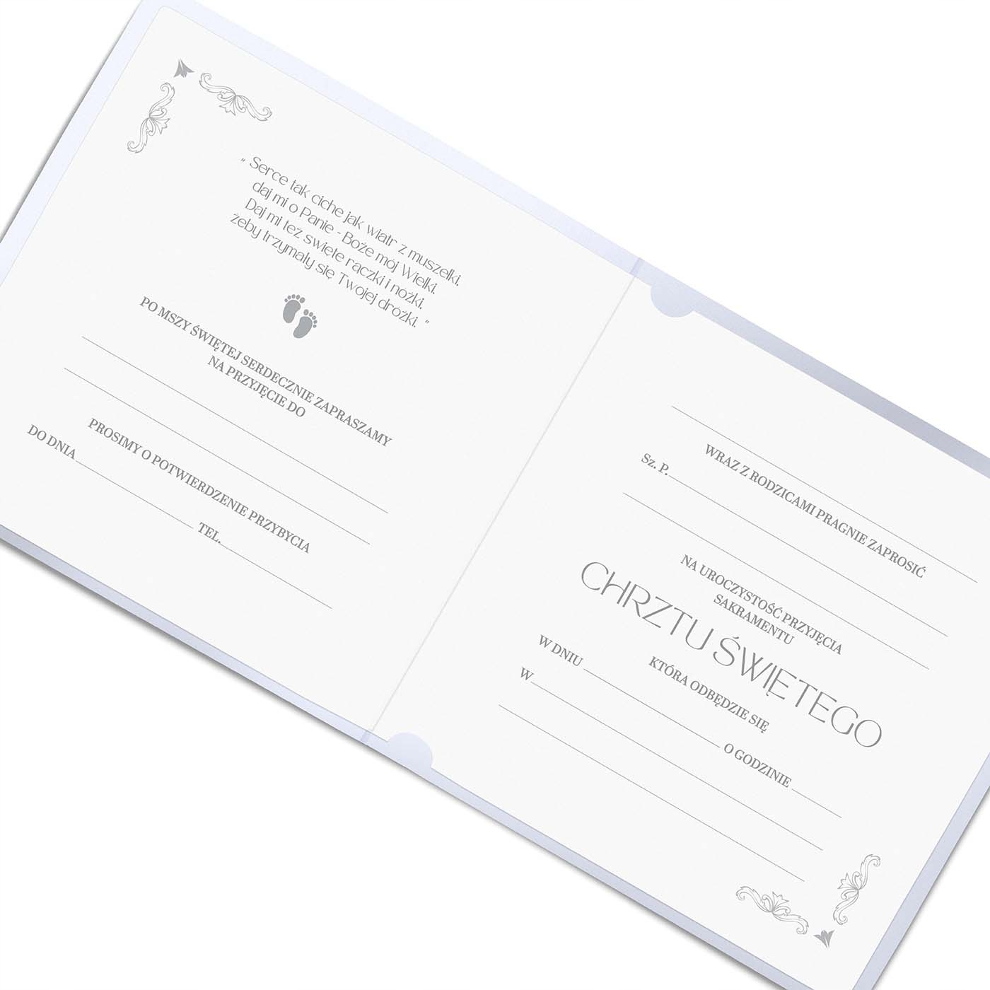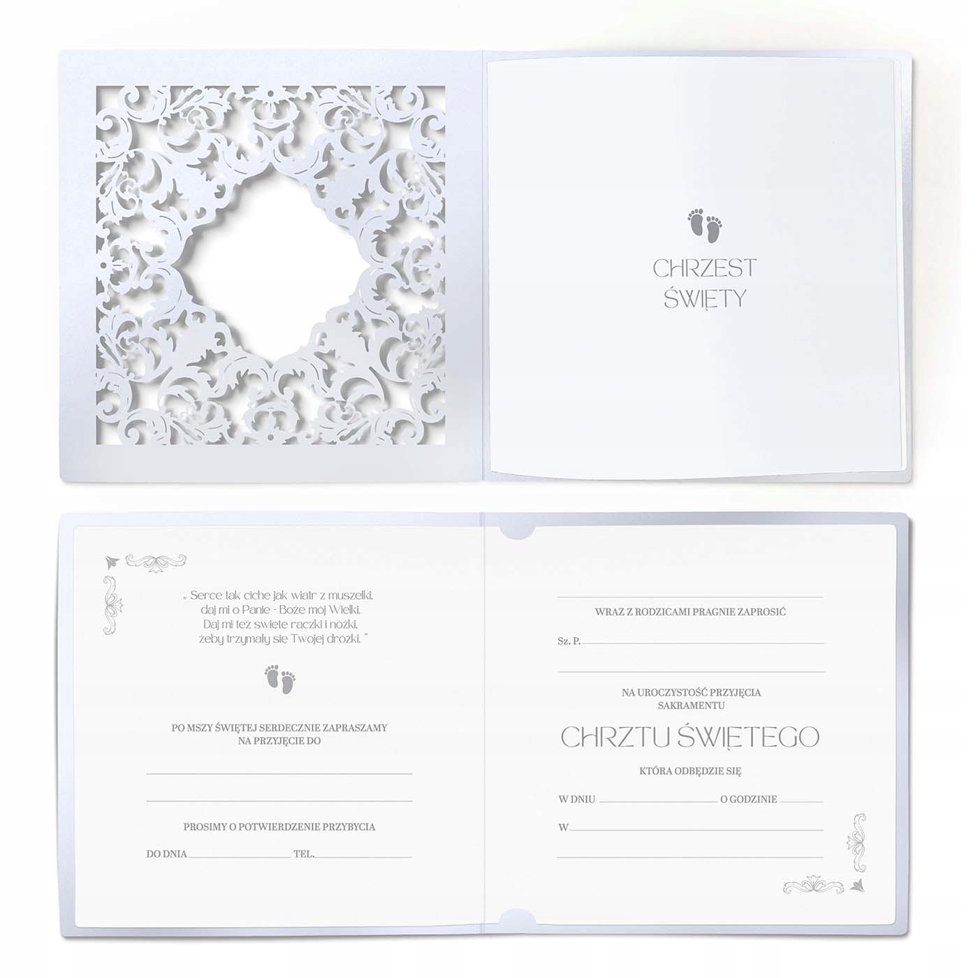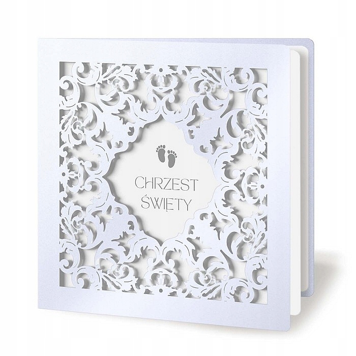 Эксклюзивное приглашение на крещение с готовым текстом, который нужно написать от руки. Изготовлен из белой металлизированной бумаги и белой матовой вставки.