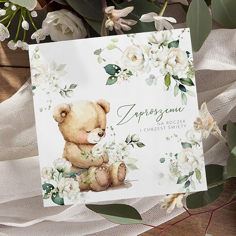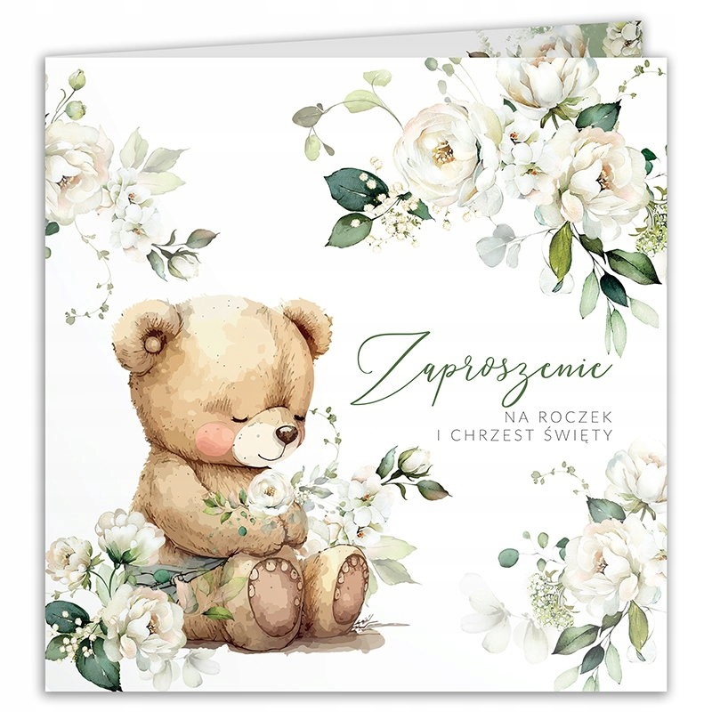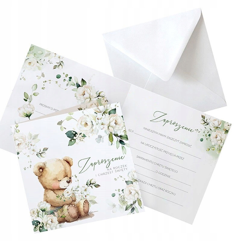 Приглашения на крещение и годовалую годовщину с красивым мотивом плюшевого мишки среди белых роз. Отличный выбор, чтобы пригласить гостей на совмещенное празднование первого дня рождения и крещения. Приглашения изготовлены из плотной бумаги, упакованы по 10 штук и продаются в белых конвертах.